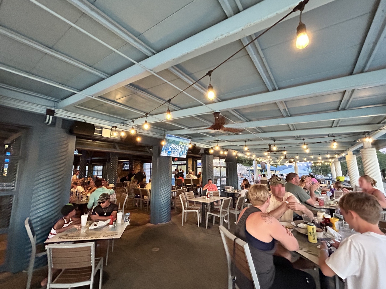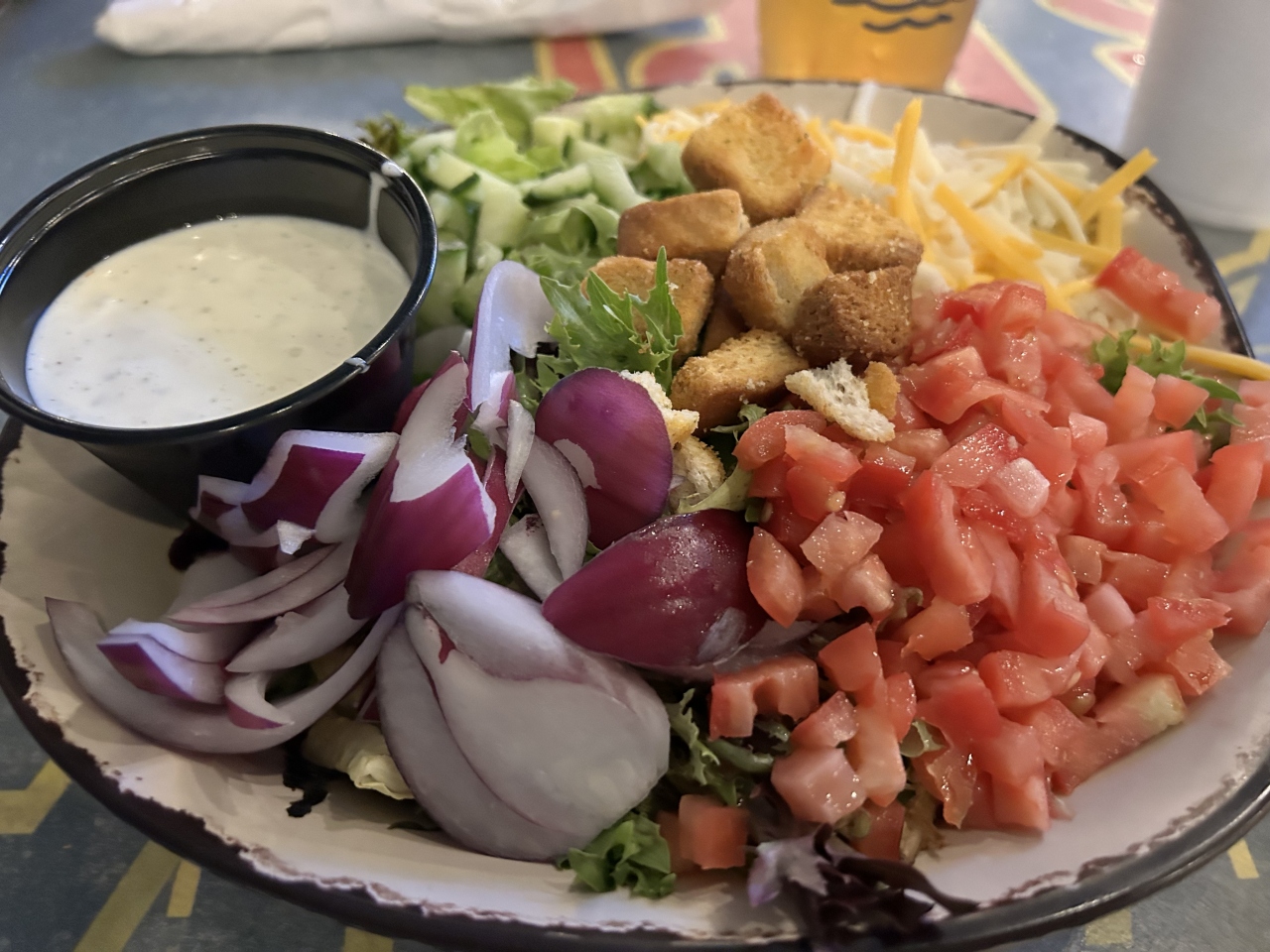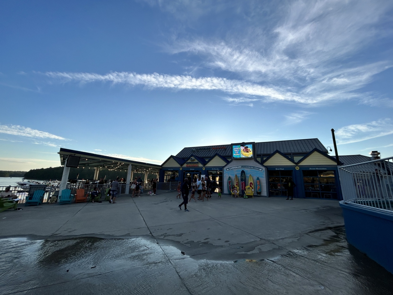 ビーチサイドのレストランでディナーしながら花火を見るのが良いかなと思い席を取りました。すぐには席の空きがありませんでしたので少し待ってから着席。頼んだわけではないのですが、ちょうど花火が見えそうなテラス席に案内してくれました。まずはビール、そして「ハウス・アントレ・サラダ(HOUSE ENTRÉE SALAD)」および「ランドシャーク・フィッシュ&チップス(LANDSHARK FISH & CHIPS)」をオーダーし、これらをつまみながら花火鑑賞。料理は普通でしたが花火鑑賞に絶好のレストランでした。
