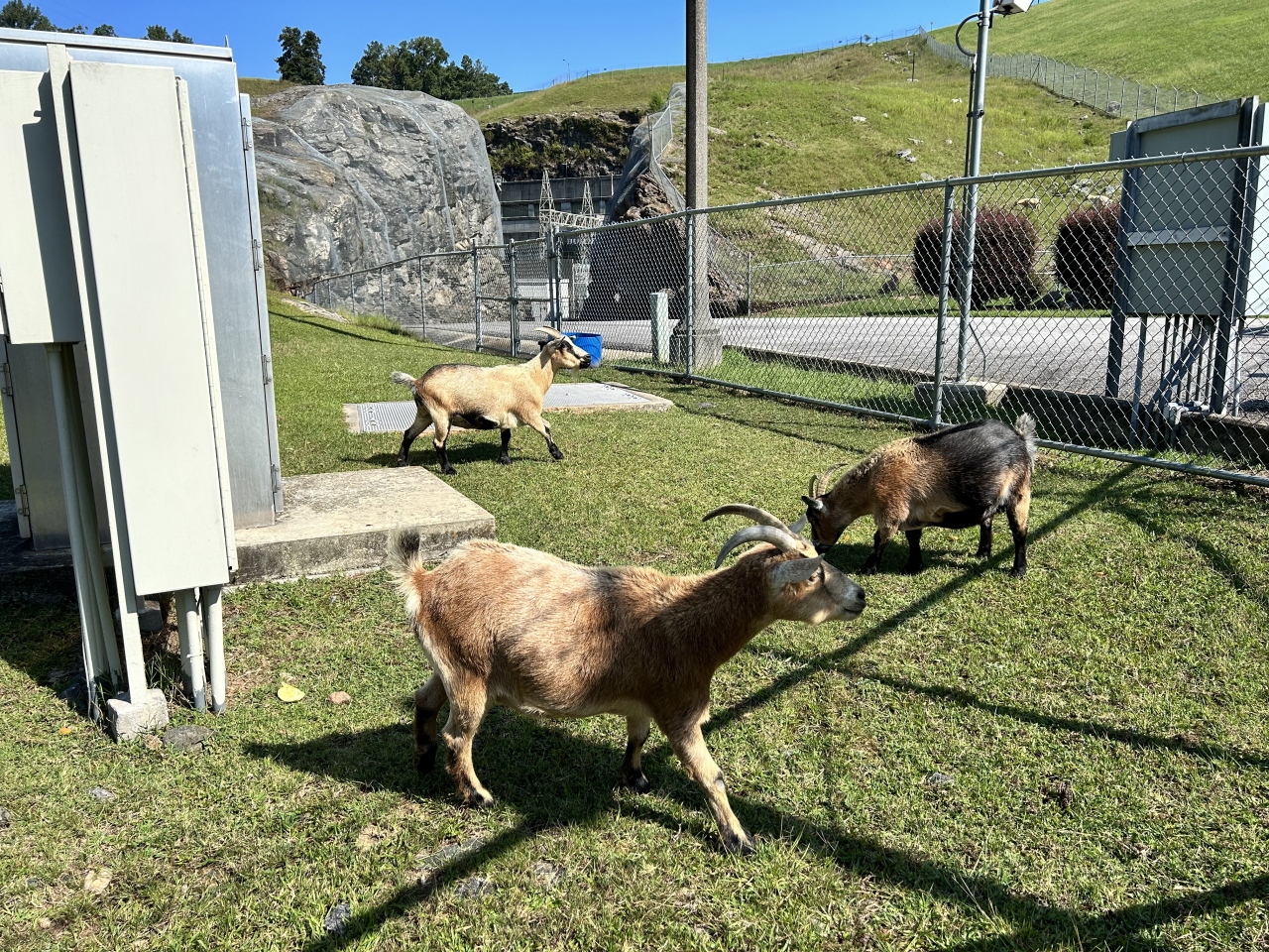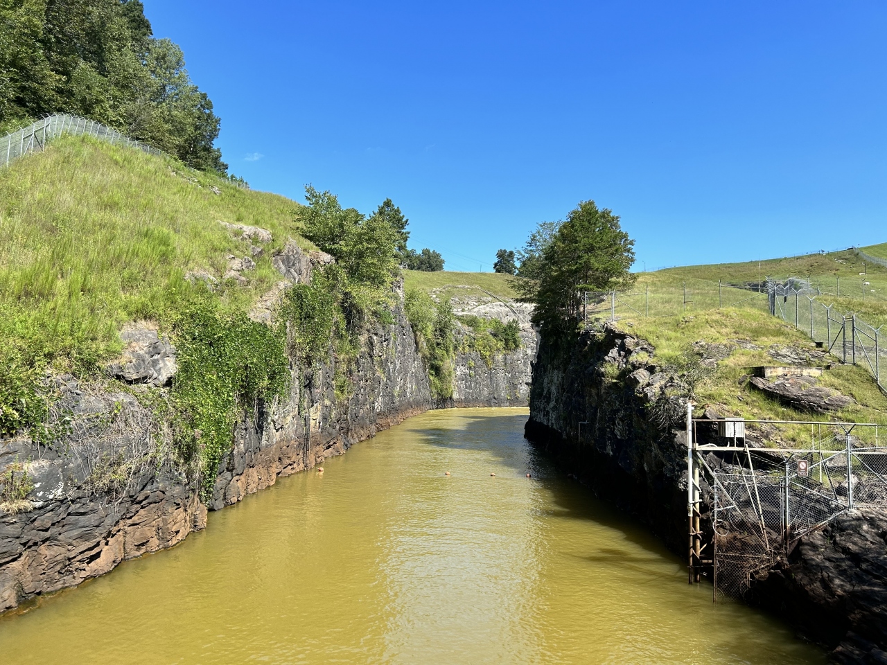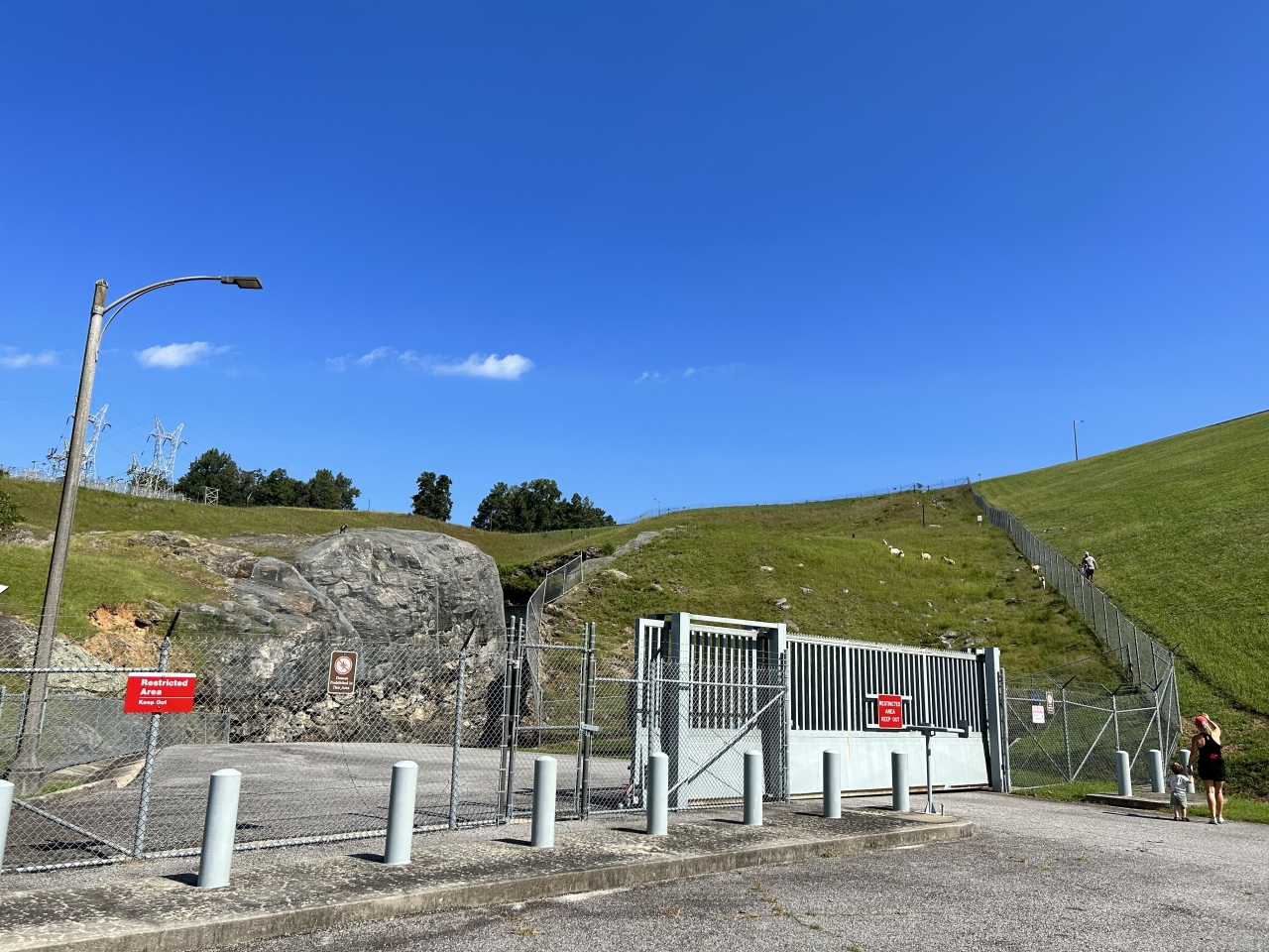 ブフォード・ダムは、ジョージア最大の湖である人口湖であるラニアー湖を形成するダムです。ヤギが放し飼いされていました。ダムが堰き止めているチャタフーチ―川に架かる橋から見てみると放流水路が見えます。この先に一応、発電施設があるようです。下流側は釣りスポットになっていて、釣りをしている人が点在。ダム周辺にはトレイル・ルートもあり散策ができます。