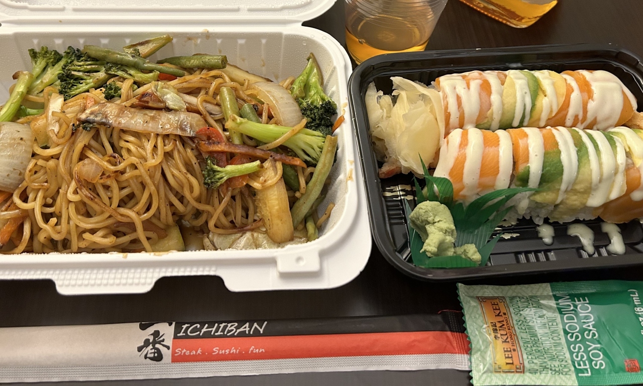 「ミッション・インポシブル」という寿司ロールと、「ベジタブル・ヤキソバ」をテイクアウト
