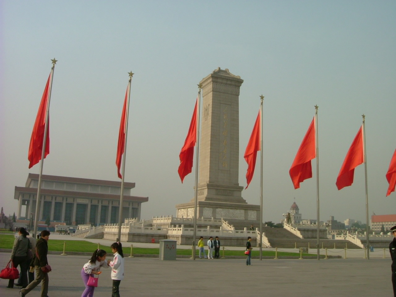 人民英雄紀念碑は、天安門広場の中軸線上。毛主席記念堂の北側です。碑には、毛沢東の揮毫で「人民英雄永垂不朽」(人民の英雄は永遠に不滅だ)。中国革命を戦った英雄たちの顕彰をしつつ、今の中国が永遠に続くことを祈っているのですね。ここも衛兵が監視していて、近づくことはできません。