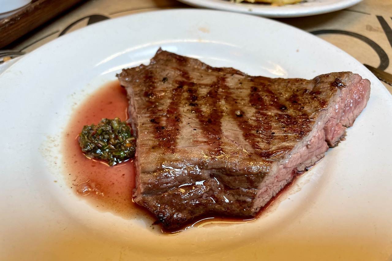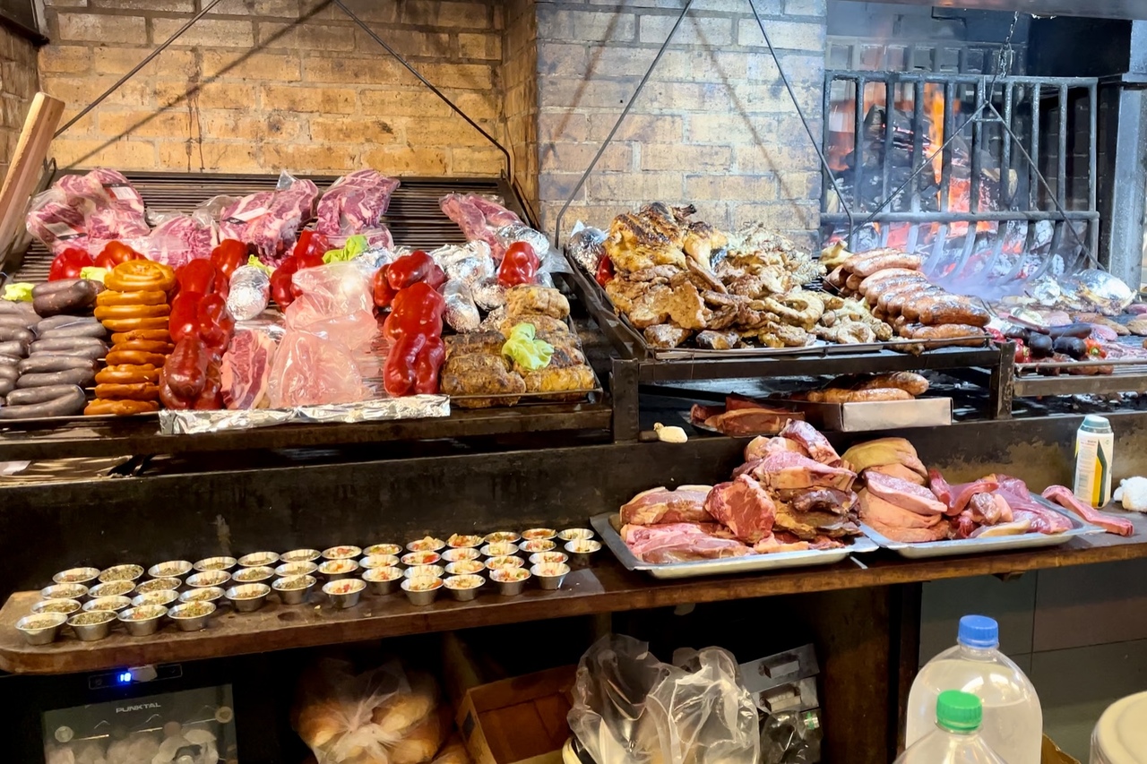 古めかしい大きな建物の中にはカウンター形式のパリージャのレストランが並び、目の前で焼かれたステーキやソーセージ、野菜などを楽しめます。