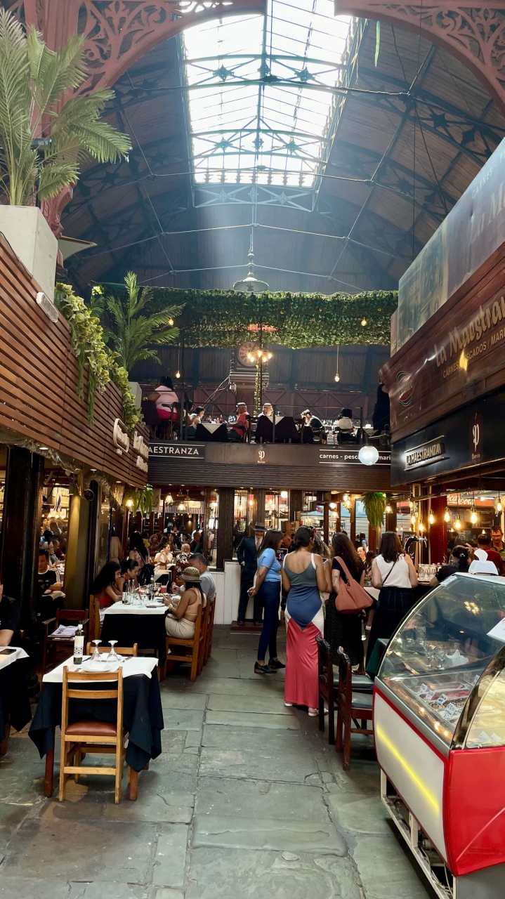 ウルグアイスタイルのパリージャのレストランが並ぶ活気のある屋内マーケット