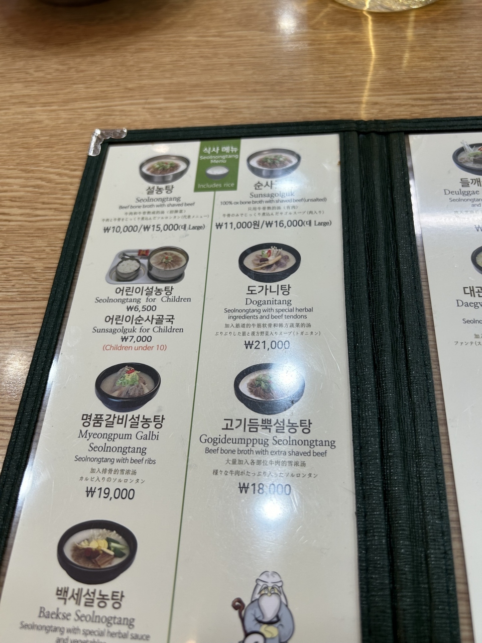 明洞の同じ場所(ソウルロイヤルホテルの向かい)にリニューアルオープンしました。以前は24時間営業だったので、遅い時間や早朝でも食べることができましたが、今は8時頃の開店で21時閉店です。大変でしょうが24時間営業にもどってくれることを期待しています。イ・スンギ君のドラマ「華麗なる遺産」をきっかけに、ソウルに行ったときには必ずこちらのお店に行っています。リニューアルで明るいポップな感じの店内になりました。以前あったドラマの写真はなくなっていました。ソルロンタンは変わらずの美味しさです。優しいスープの味が好きです。初めは何も入れずにスープをいただき、途中からキムチを入れながら食べるのが私の定番です。女性一人でも入りやすお店です。