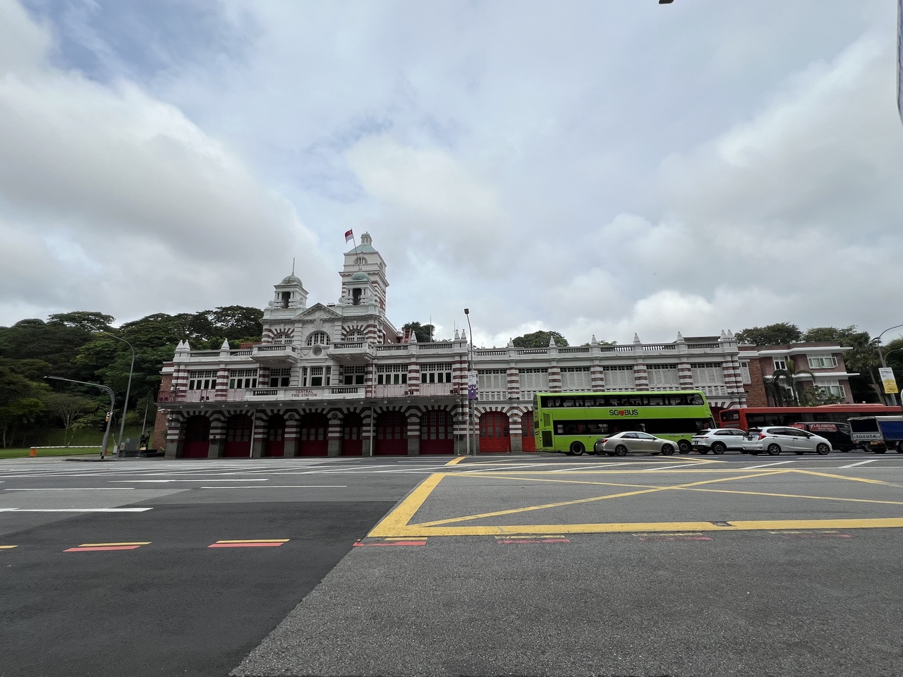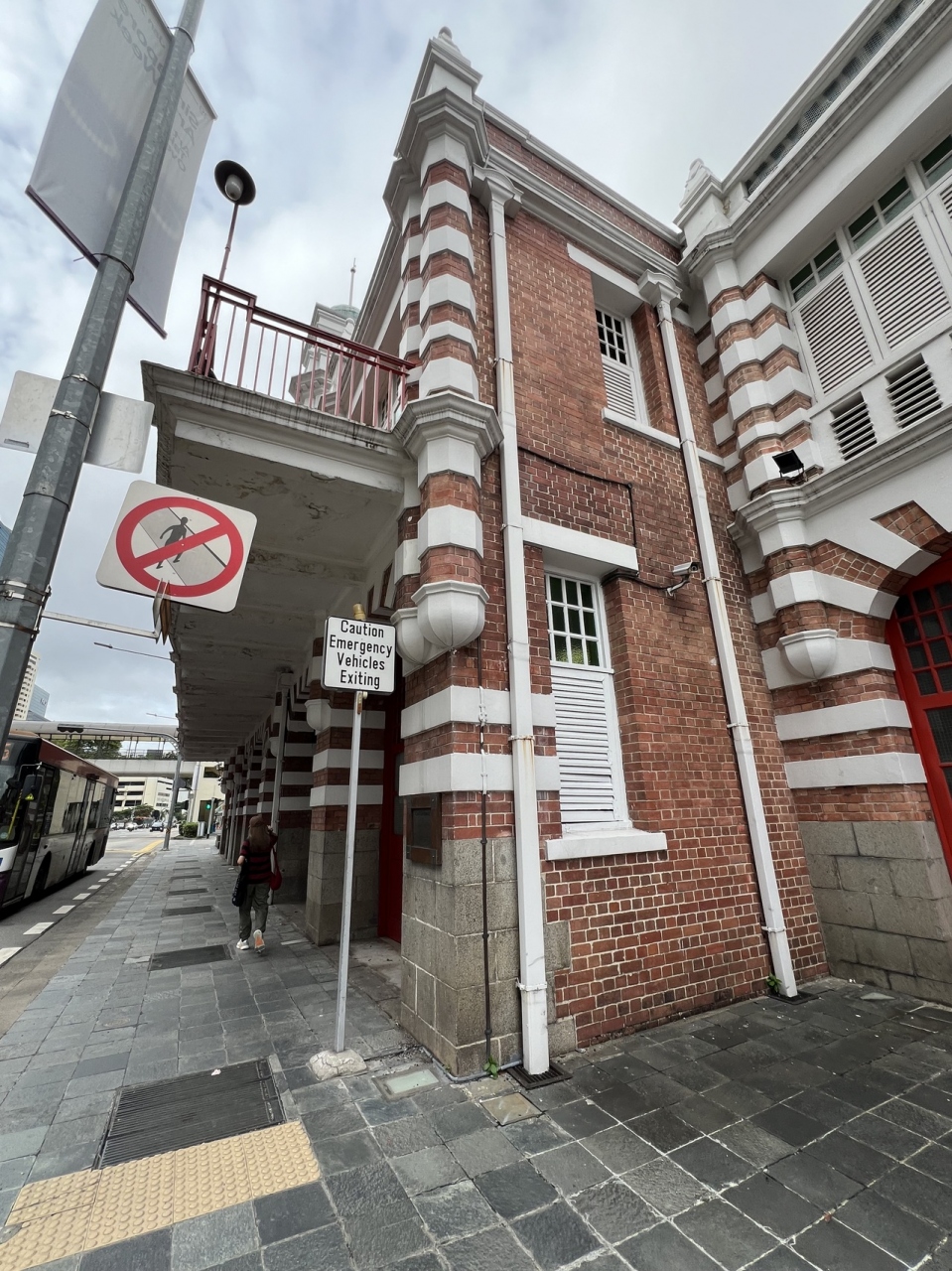 赤レンガと白い装飾のクラシカルな建物はなんと現役の消防署です。実際、「緊急車両あり」という看板もありました。消防署として使われているため外観の見学になりますが、建物の全体を見ようと思ったら、道路の反対側に渡った方がいいと思います。