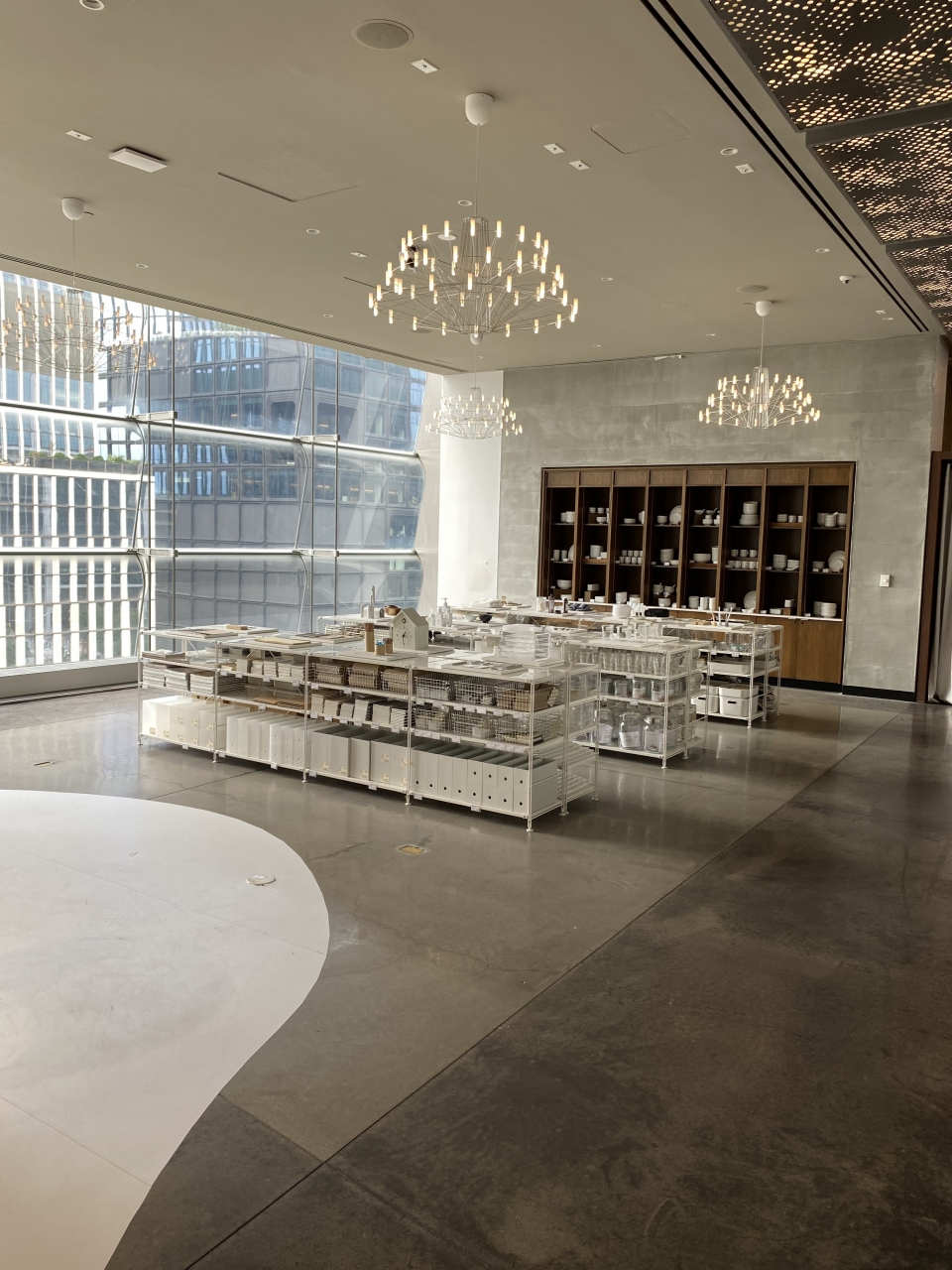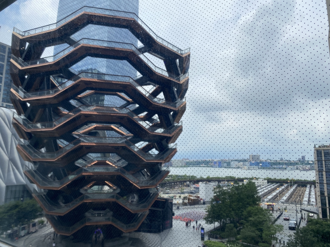 各種ブランドやレストランなど100店以上のショップを擁する大モール「ハドソンヤード」の中にあるMUJI(無印良品)です。販売エリアはそう大きくなく、日本の店舗のような豊富な品揃えではありません。というより、MUJIのコンセプトを伝えるショールームのような感じです。(展示物の解説は日本語でした。対象は日本人?) 窓からはパブリックアートの建造物「ヴェッセル」が見渡せます。