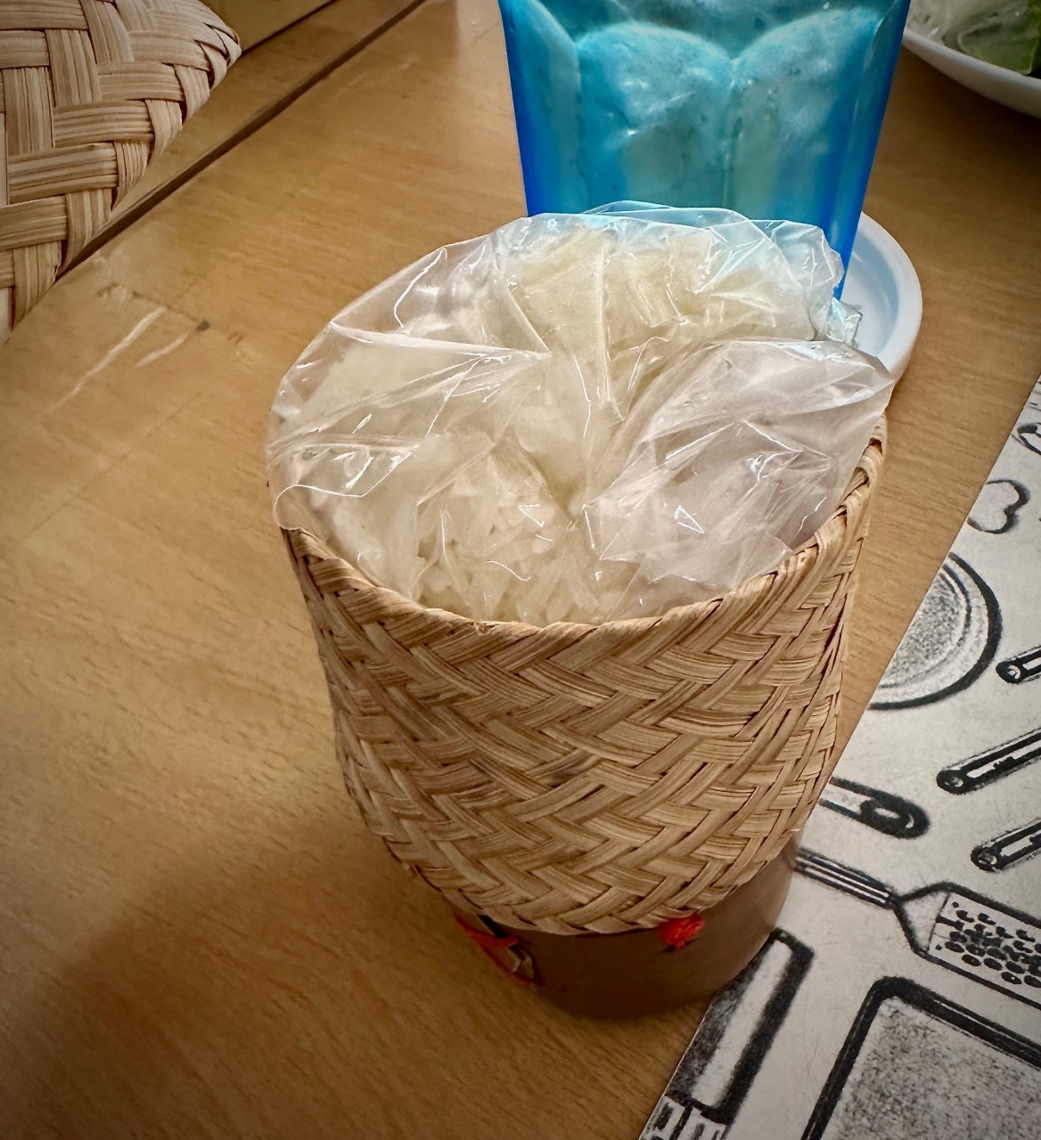 このお店はカゴに直にご飯を入れないで、ビニール袋に包んで出てきた...こんなの初めて見たわ...
