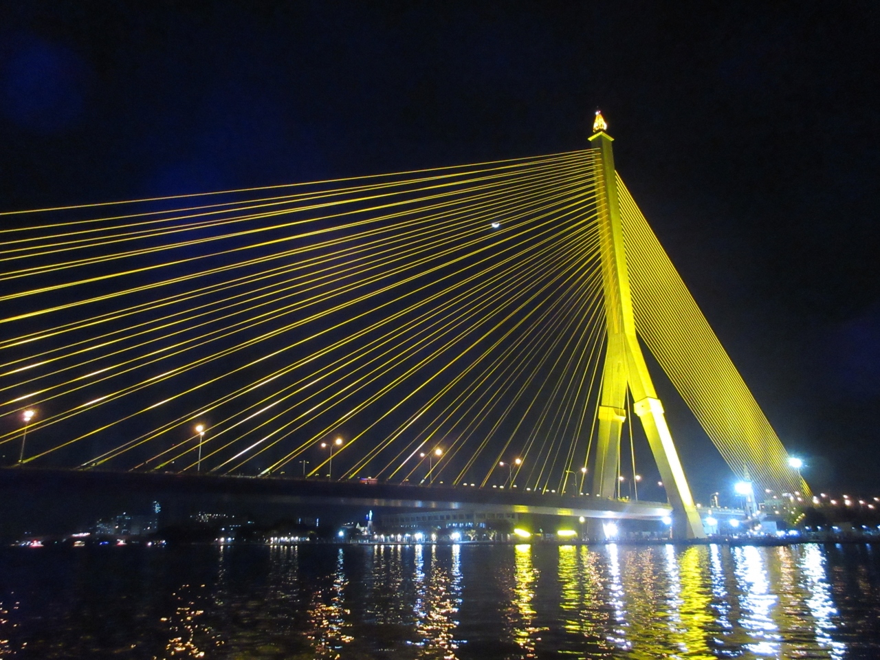 バンコクを流れる大河。場所によって結構川幅に差がありワットアルンのあたりでは余り広くなく、河口付近では結構広くなる。日中見ていると水も大して綺麗ではないし、両岸の高層ホテルが印象的な程度であるが、ナイトクルーズ等で見るとまた印象が変わる。ライトアップされたワットアルンやラーマ8世橋等は得も言われぬ美しさだし、夜見る高層ホテルやアイコンサイアムのきらびやかさはさすが観光都市バンコクの面目躍如といったところ。