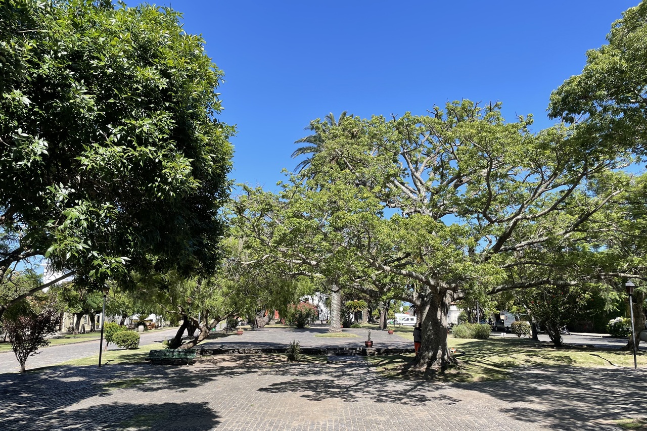 世界遺産の町コロニアのセントロにある広場。マヨールと名付けられているので町のメイン広場なのですが、他の街にあるような美しい建築の教会やお役所など何にもなく、低い木々の生えた原っぱというかんじです。せいぜい2階までのホテルやカフェ、ミュージアムなどが周りを囲んでいます。週末には工芸品の屋台が並びます。