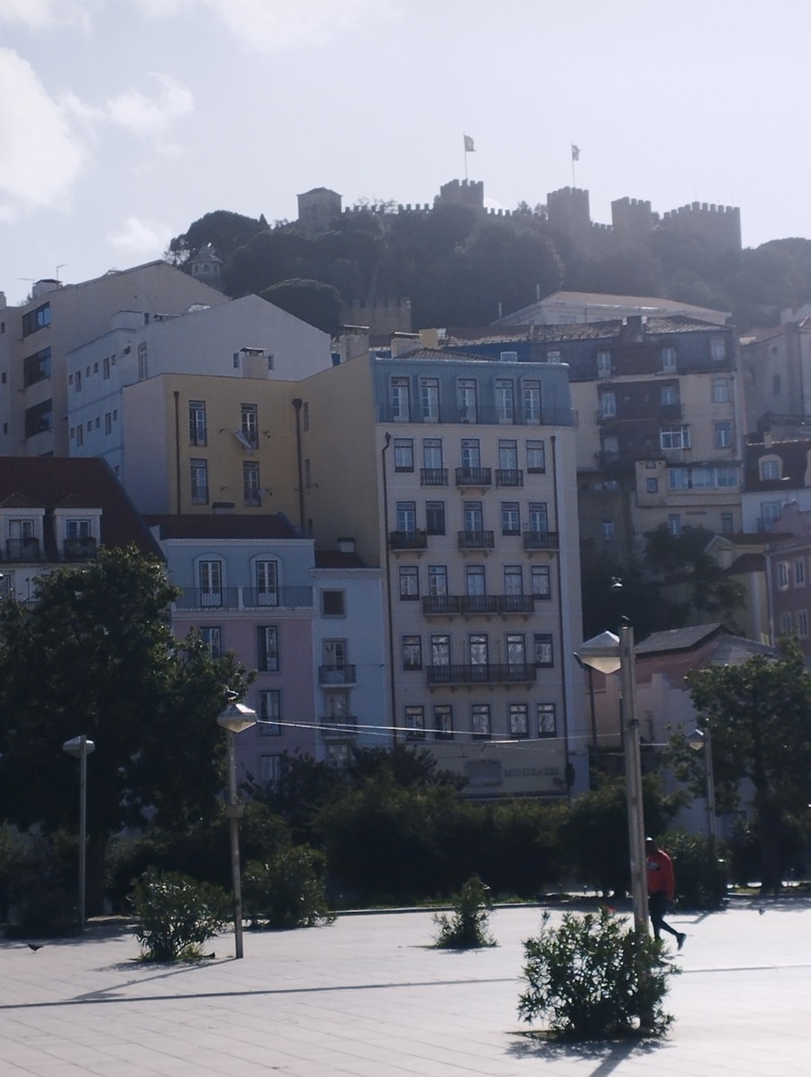 道路わきにある広めの広場です。広場脇の道路から、上にサンジョルジェ城の城壁が良く見えました。