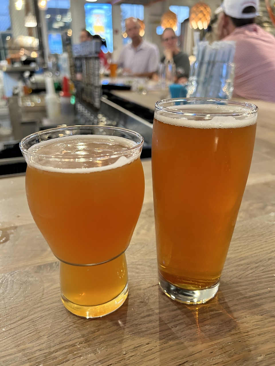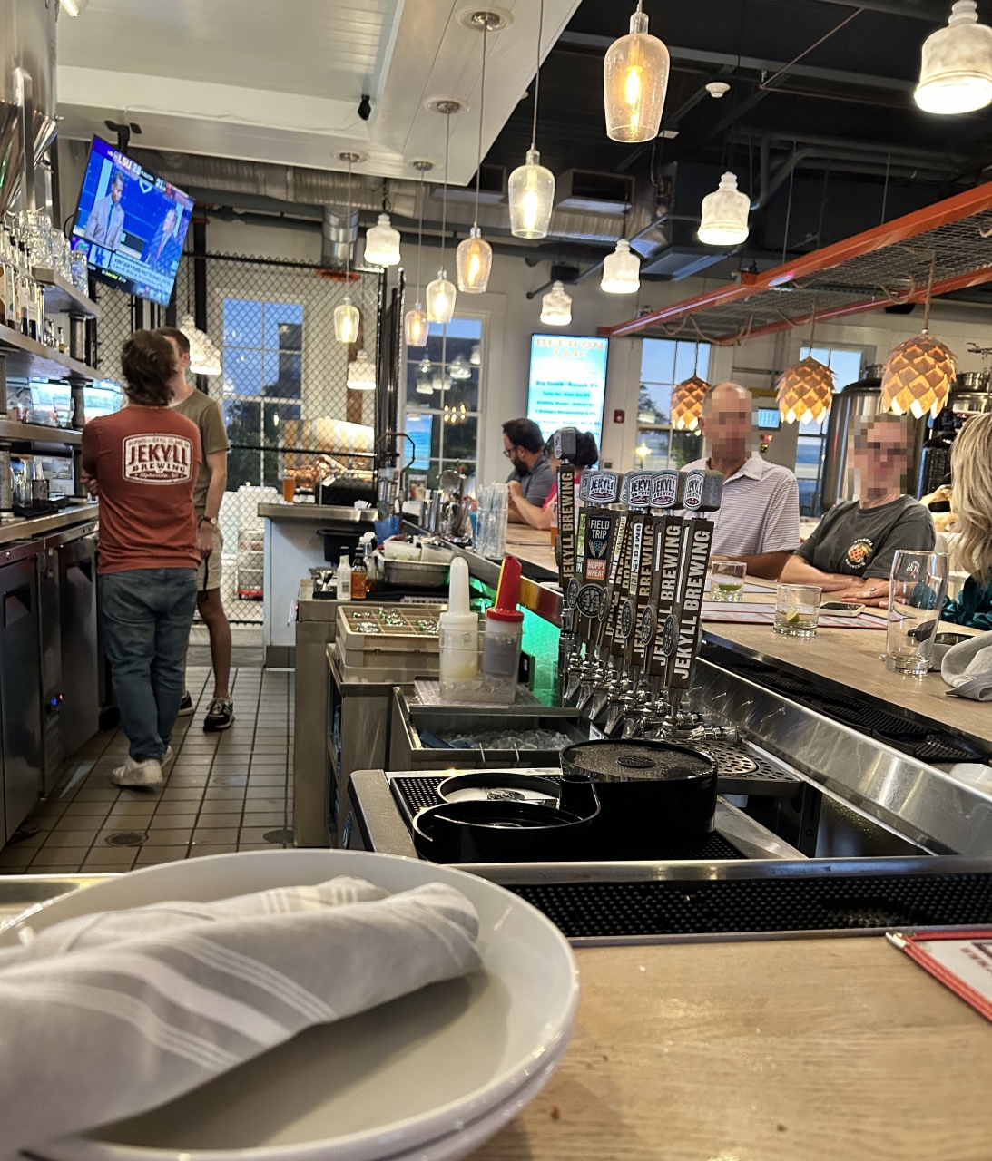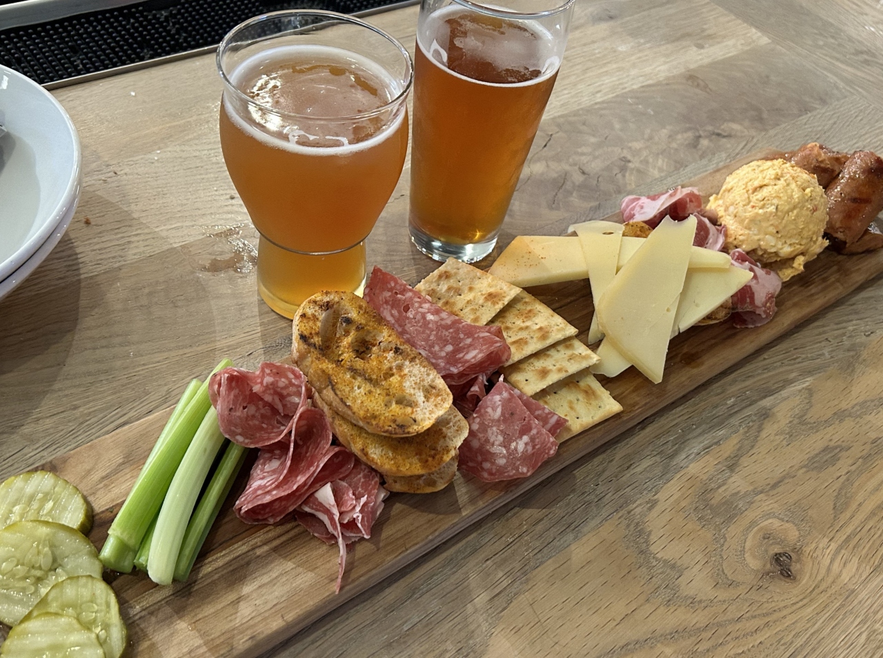 1階は別のレストランで、ブリュワリーは2階になります(最初は間違えて1階のレストランに入ってしまいました)。ブリュワリーへは建物横の2階の入口から。カウンターの端っこに陣取りました。私は「タリホー・イングリッシュ・ペール・エール(Tally Ho English Pale Ale)」、妻は「ジャック・タウン・コースタル・ラガー(Jack Town Coastal Lager)」をオーダー。あえてカウンターにしましたが、テーブル席も多い広いブリュワリーです。ビールのお供には「シャルキュトリー・プレート(Charcuterie Plate)」、これはもうビールのつまみに最高でした!