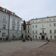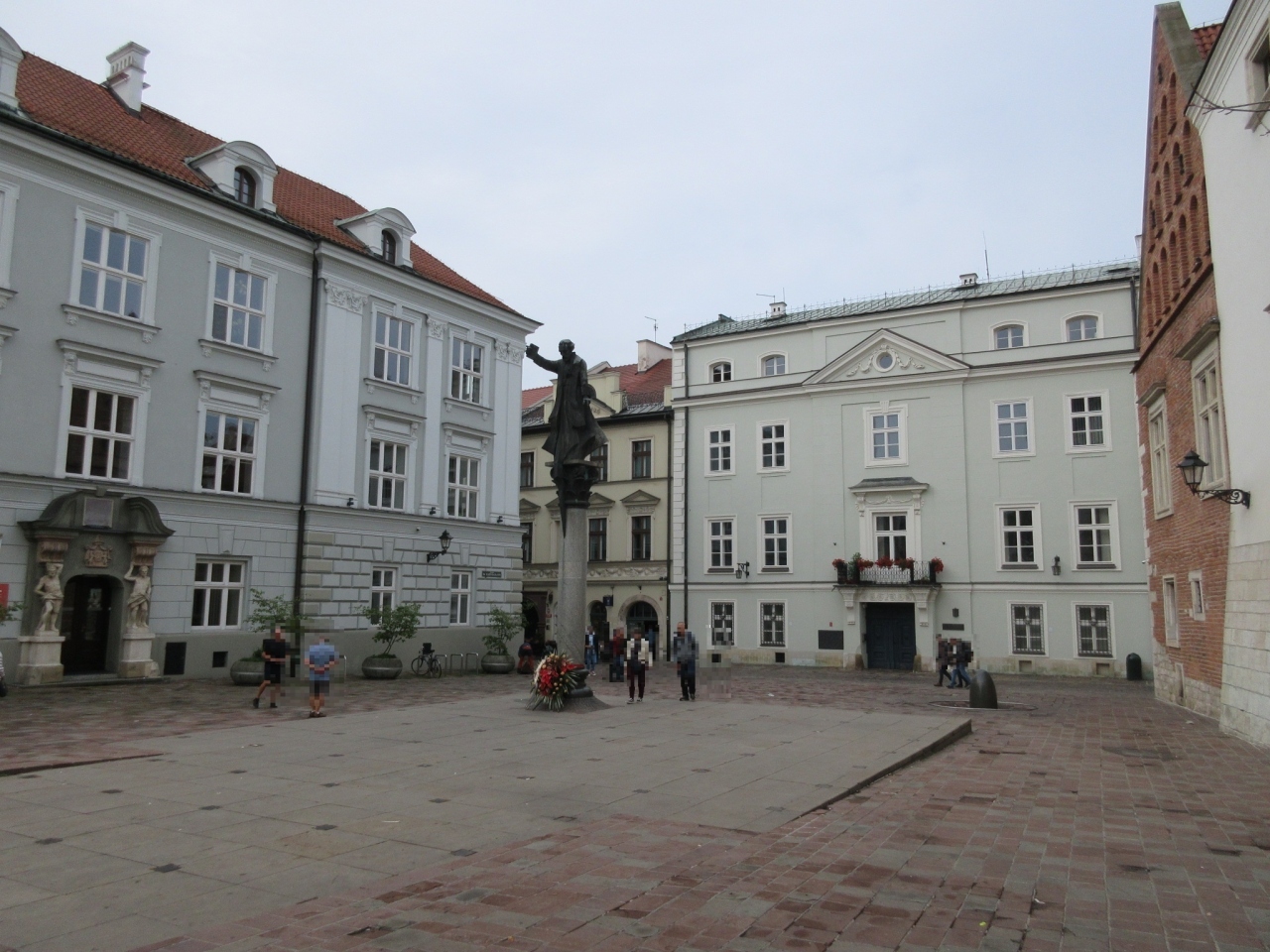 クラクフ旧市街を散策し、【中央広場】から【グロツカ通り】に沿ってヴァヴェル城に向かう際に、右手にあるこちらの銅像が目に留まりました。右手を斜め上にあげているポーズは日本の某俳優が「頑張っていこ~」とでも言っているような風貌でユニークでした。立派な建物に囲まれた広場の中央に置かれていて、とても目立っていました。