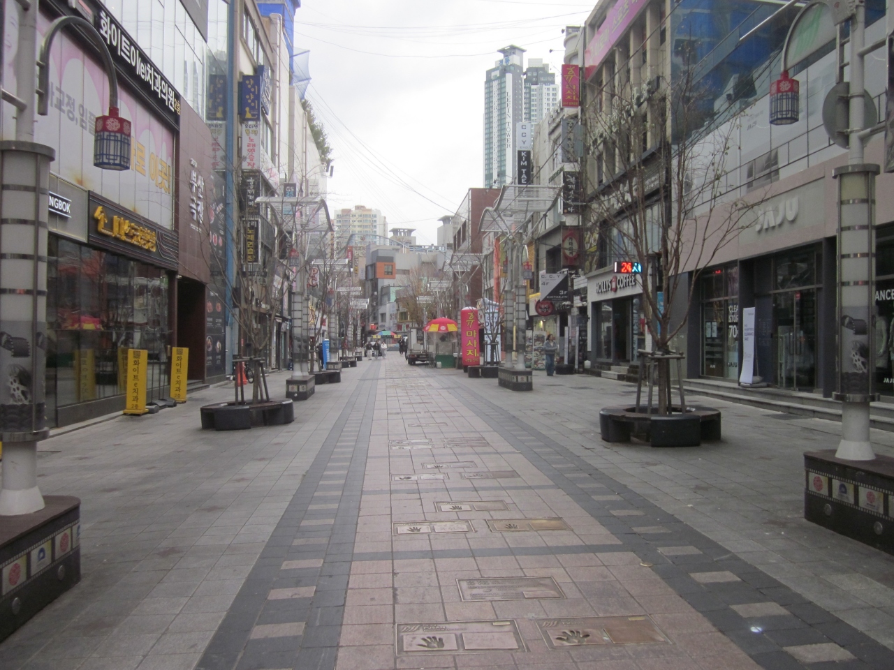 チャガルチ駅の向かい辺りにBIFF広場があります。通りは、屋台が沢山並んでいて、食べる歩きにも人気の通りです。地面を見ると、手形のような彫刻があって面白い通りです。観光客も多くて、日本人の方も見かけました。