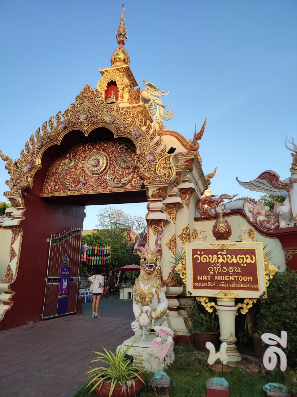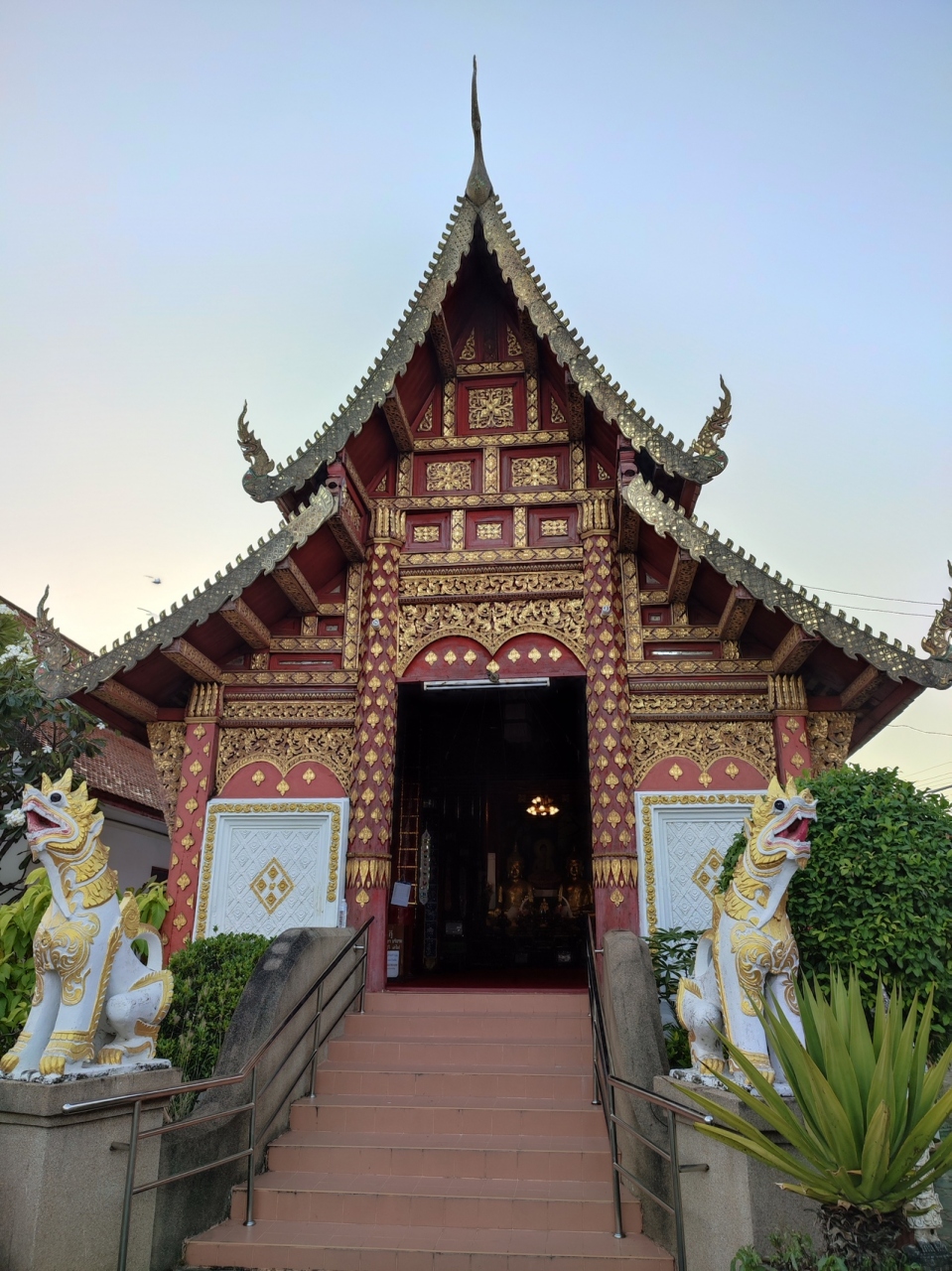 チェンマイ門から北に走るお寺の多い通り沿いにあります。最初は裏から入ったので比較的地味な印象でしたが、表に回るとなかなか装飾などもきれいでした。かといってそれほど観光客も多くないのでゆったり見学できました。