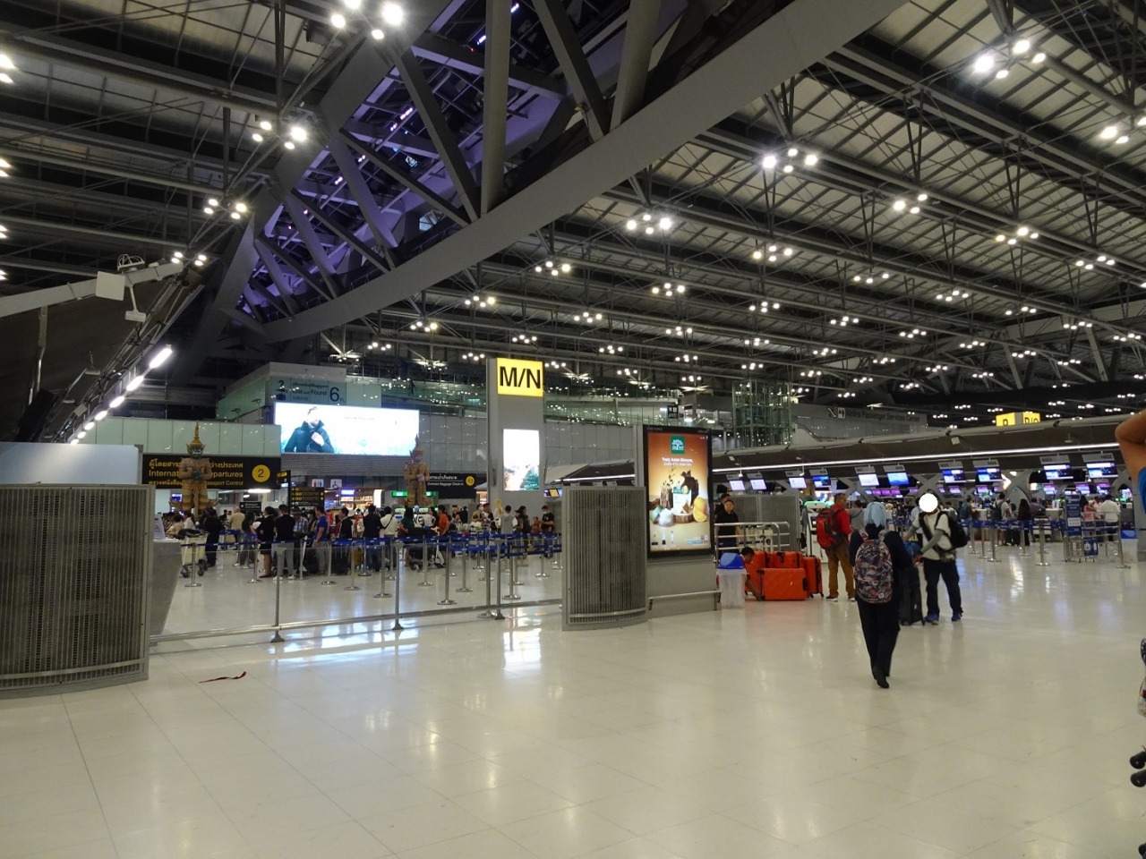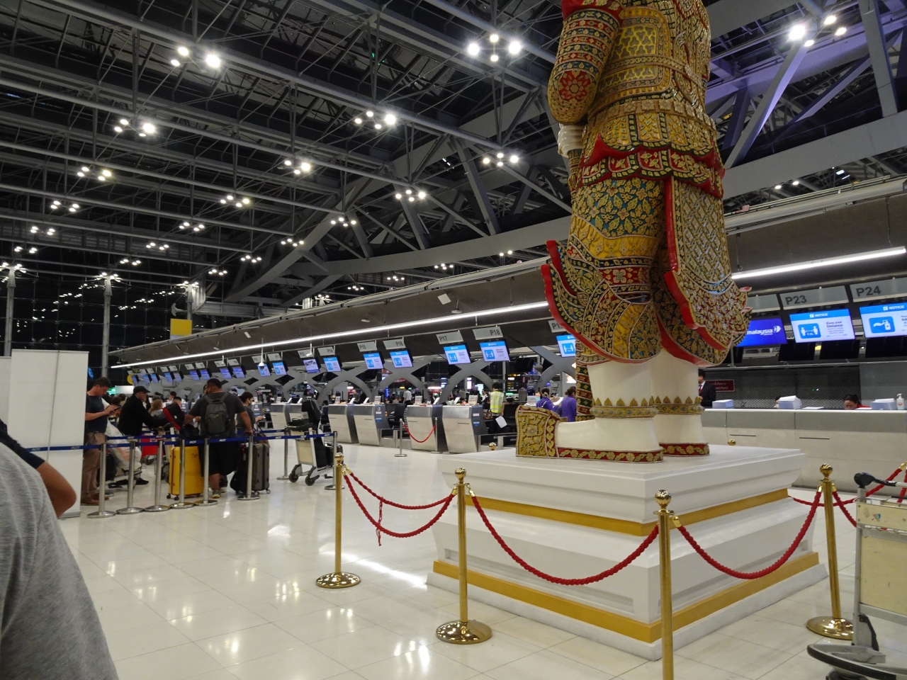 バンコクの空の玄関口がスワンナプーム国際空港。2019年以来、久々に利用しました。出発便がJAL便だったので、チェックインカウンターは搭乗の3時間ちょっと前にオープン。長蛇の列ができていました。大きな空港で、どこも人で混雑していました。出国時も、少し混雑あり。なので、搭乗前のショッピングにそれほど時間が取れず、残念に思いました(苦笑)。また、到着時では、早朝着だったので、入国にはそれほど時間はかかりませんでした。入国時、指紋登録と顔写真の撮影があります。時間帯が良かったのか、以前よりスムーズに感じました。