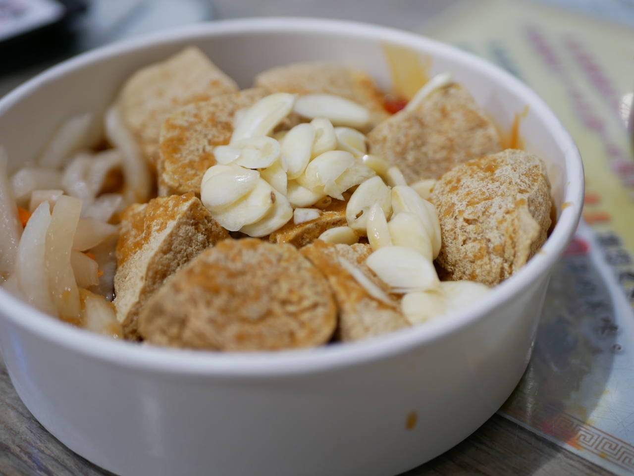 せっかくなので名物を、ということで干しエビなどと一緒に蒸した臭豆腐と揚げた臭豆腐をいただきました。蒸した臭豆腐は出汁が効いていてとても美味しかったです。口に入れると干しエビやその他具材の味が広がり、その後臭豆腐の風味がふわっと広がる感じです。夜市などで香るがつっとした香りとは違いました。