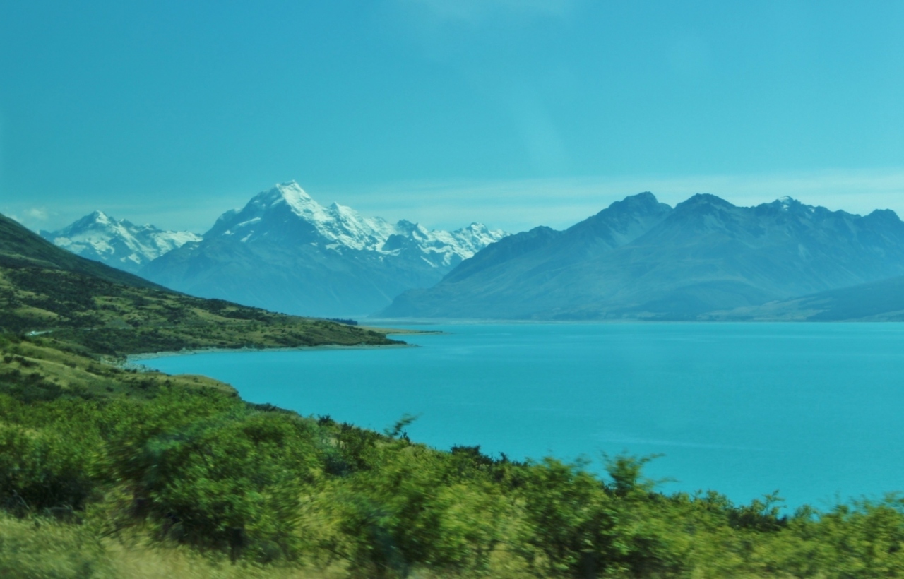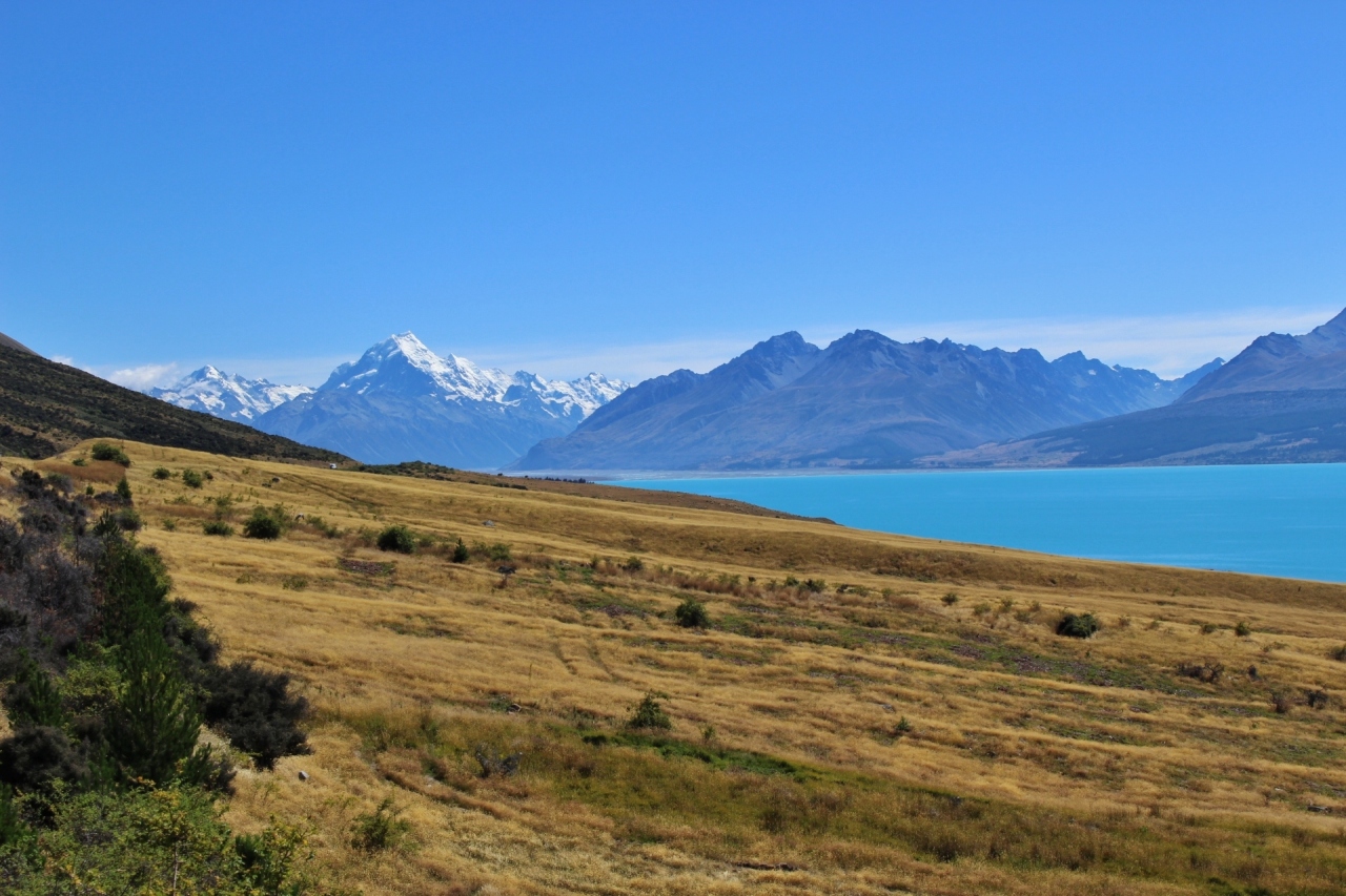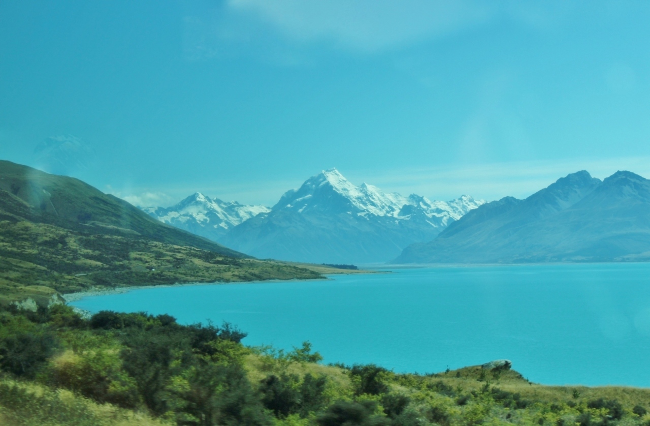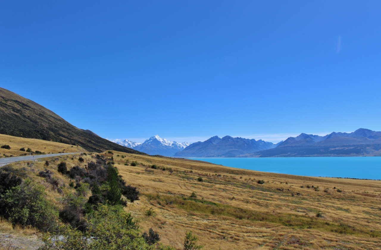 プカキ湖越しにアオラギマウントクックの勇姿を望む景色は最高であるが、おそらくピーターズルックアウトという展望台から見た景色であると思う。手前にミルキーブルーの大きな青い湖、湖の奥にはアオラギマウントクックの勇姿、そしてアオラギマウントクックに向かって湖畔を進む1本道、この景色を見たかったのであるが、おそらく大型バスを止めるのが難しかったのであろう。InterCityのバスは、ピーターズルックアウトと思う場所を通過した後で、別の場所の路肩に停めてくれた。
