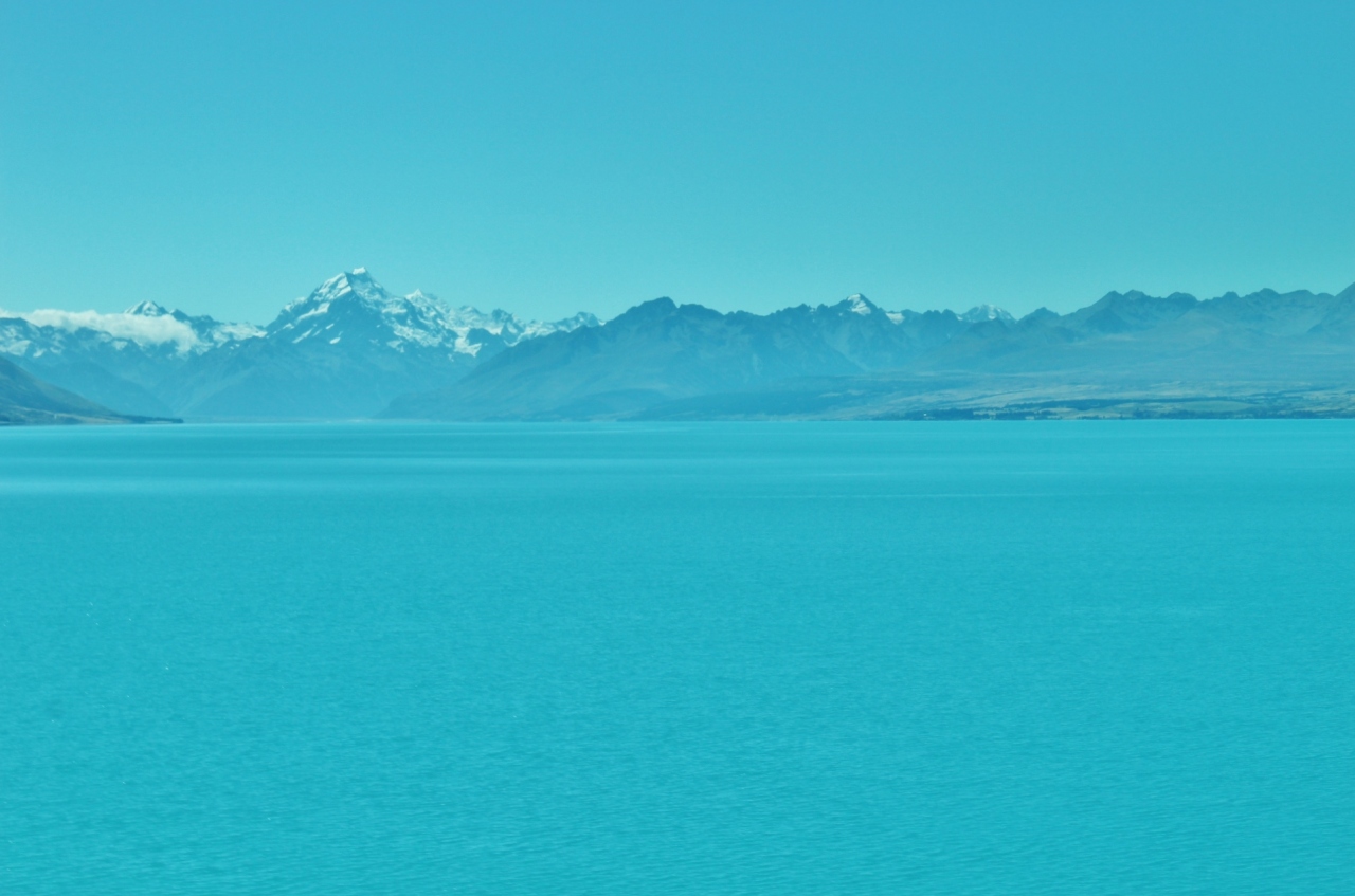 プカキ湖はマウントクックビレッジに向かう途中にある大きな氷河湖で、ガイドブック等でもあまり紹介されておらず単なる通過点となってしまう場合も多いと思うが、もったいない。氷河が削った粒子をたっぷり含んでいるので、何とも言えないミルキーブルーの美しい青色をしている。