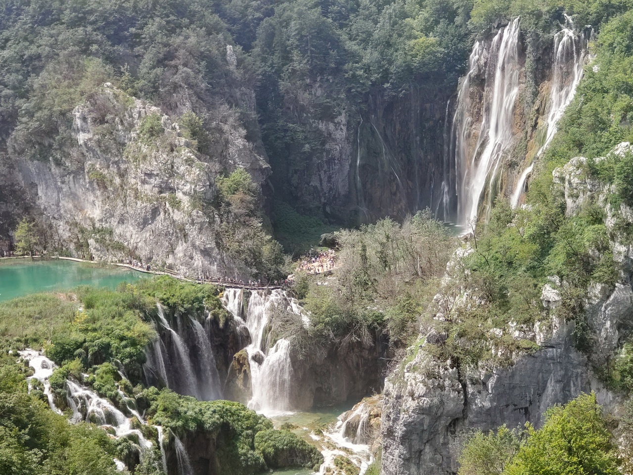 プリトヴィツェ湖群国立公園内はどこもかしこも絶景ですが、ビューポイントがいくつかあり、そこに行くとパンフレットなどに載っている写真と同じ写真が撮れます。エントランス1から少し歩くと、ビューポイントがあり、皆さん写真を撮っています。一番大きなヴェリキ滝が臨めるところや遊歩道がS字カーブになっていて2つの湖が見渡せるところです。水辺を歩くのとは違った絶景です。