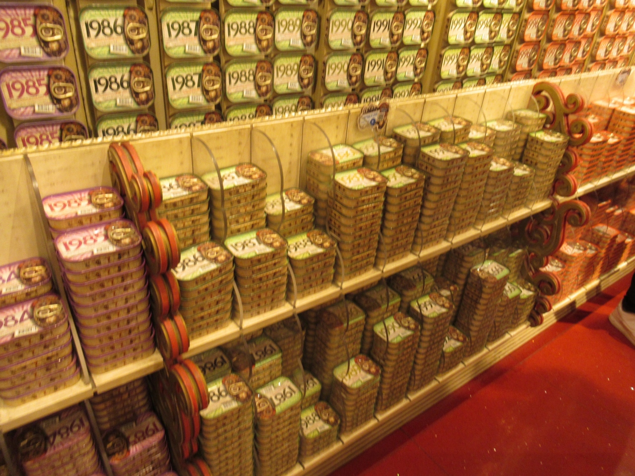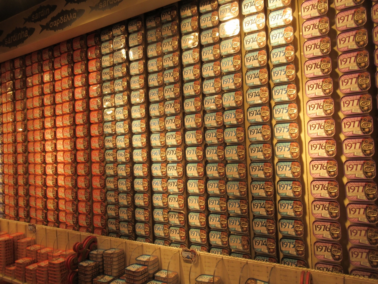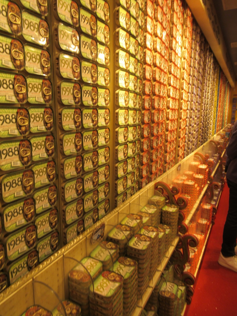 このお店のことは他の方の旅行記で目にしたことがありましたが、行ってみると店内には缶詰が壁一面に並んでいて、しかも缶の色がグラデーションとなっていました。