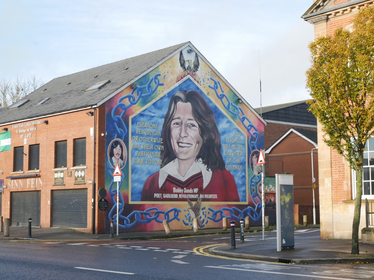 シャンキル地区には数多くの壁画がありますが、ガイドブックなどでその壁画を紹介するときによくあるのがこの壁画です。描かれている女性Bobby Sandsは元IRAで捕らえられた後1981年のハンガーストライキで獄死した人物です。