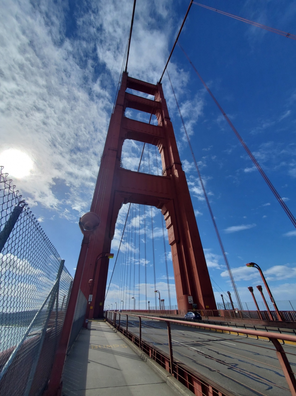 サンフランシスコで最も有名な観光名所の橋です。全然ゴールデンではありませんが多くの人が訪れます。片道歩くと20分強かかります。復路にバスの時刻を合わせるのは難しいと思うので、行きはバスで行き帰りは徒歩で行くのをおすすめします。また自転車を利用する人も多く、左側が自転車レーン右側が徒歩レーンとなります。