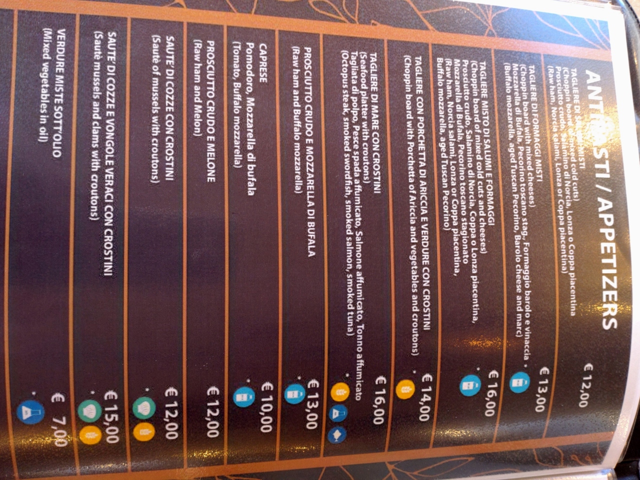 TheForkで予約すると40~50%割引でした。英語とイタリア語、バイリンガルのメニューがあり、食材の明記もあるので、選び易いです。