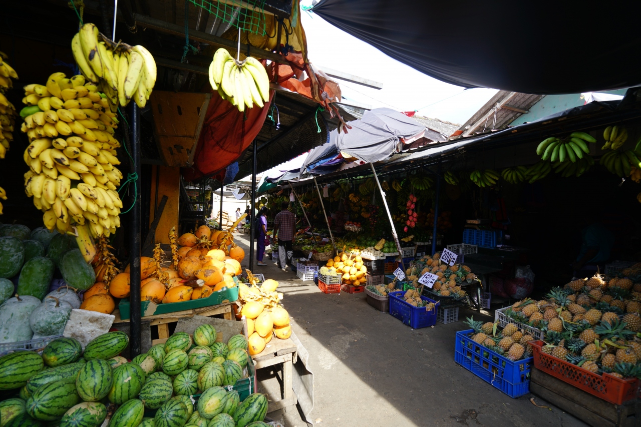 世界遺産の街キャンディの街歩きで寄りました。キャンデイ中心の市。たくさんの果物、西瓜、バナナなどが並びます。フルーツが豊富なスリランカ。パイナップルもあります。ここでドリアン買い、ホテルで食べました。