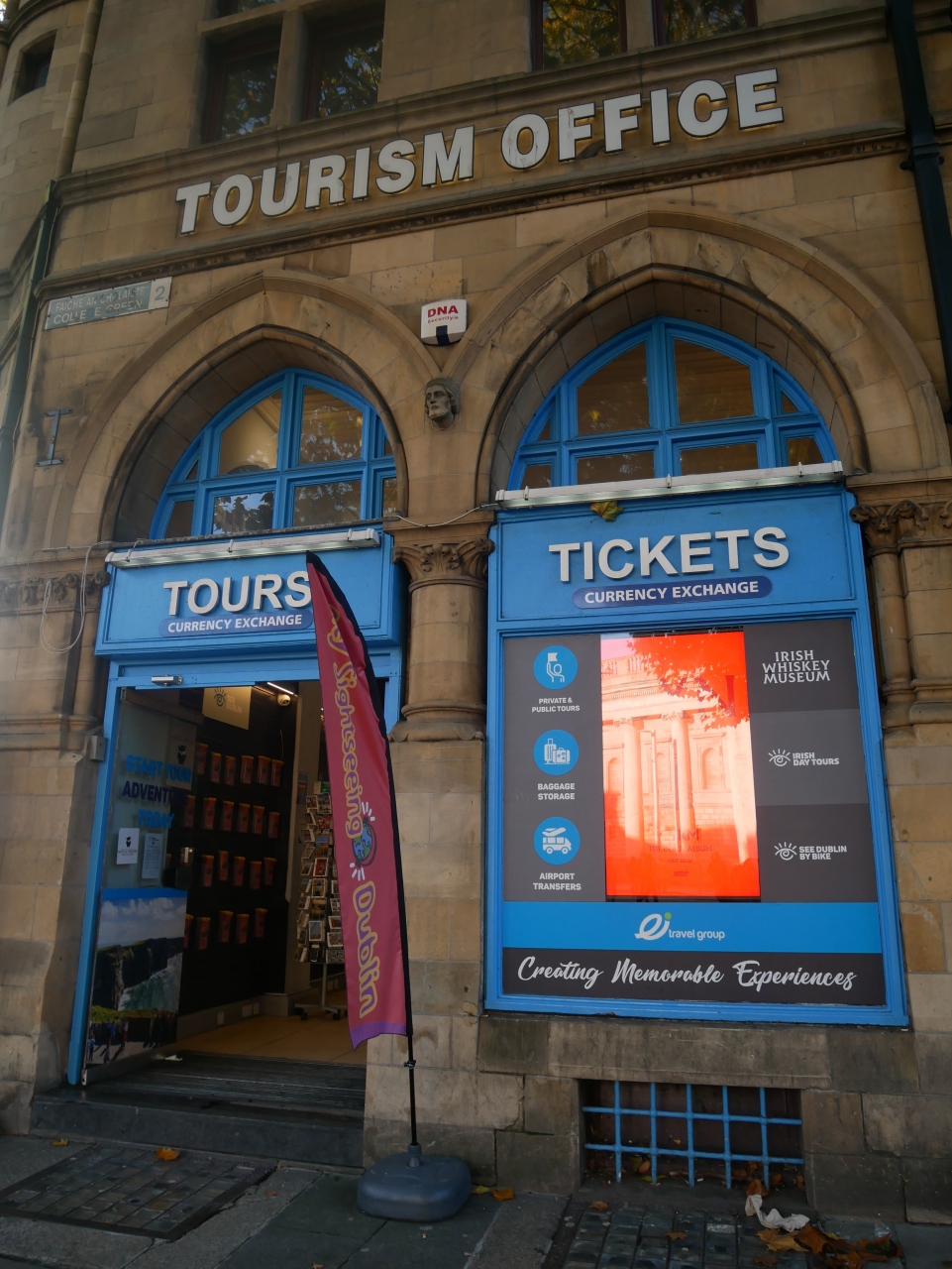 トリニティカレッジに向かいあたり、待ち合わせ場所としても有名なモリーマローン像のすぐ近くにある観光案内所でまだ観光スポットが開いていない9時頃に行った時点で開いていました。