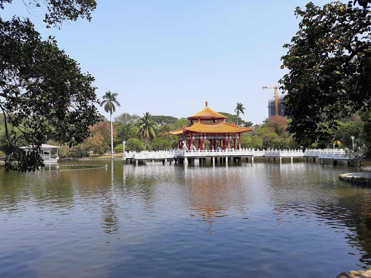 その方法で行くと、公園を斜めに進める道があり、その先に広い池と中国風の建物が浮かぶ島が見える場所に出ます。