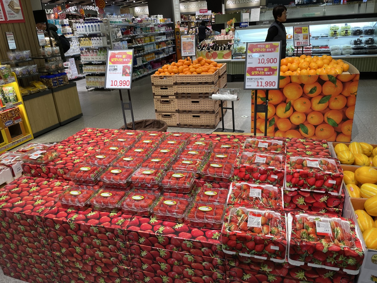 地下にあります。3月はイチゴシーズンで果物コーナーに並ぶイチゴの赤色が鮮やかでした。野菜、果物、鮮魚、生肉、調味料やラーメン、お菓子、酒とそれ程広くはないけれどほとんどのものが揃い便利です。唯一不便なのは即時免税手続きはできず、空港で行う必要があります。