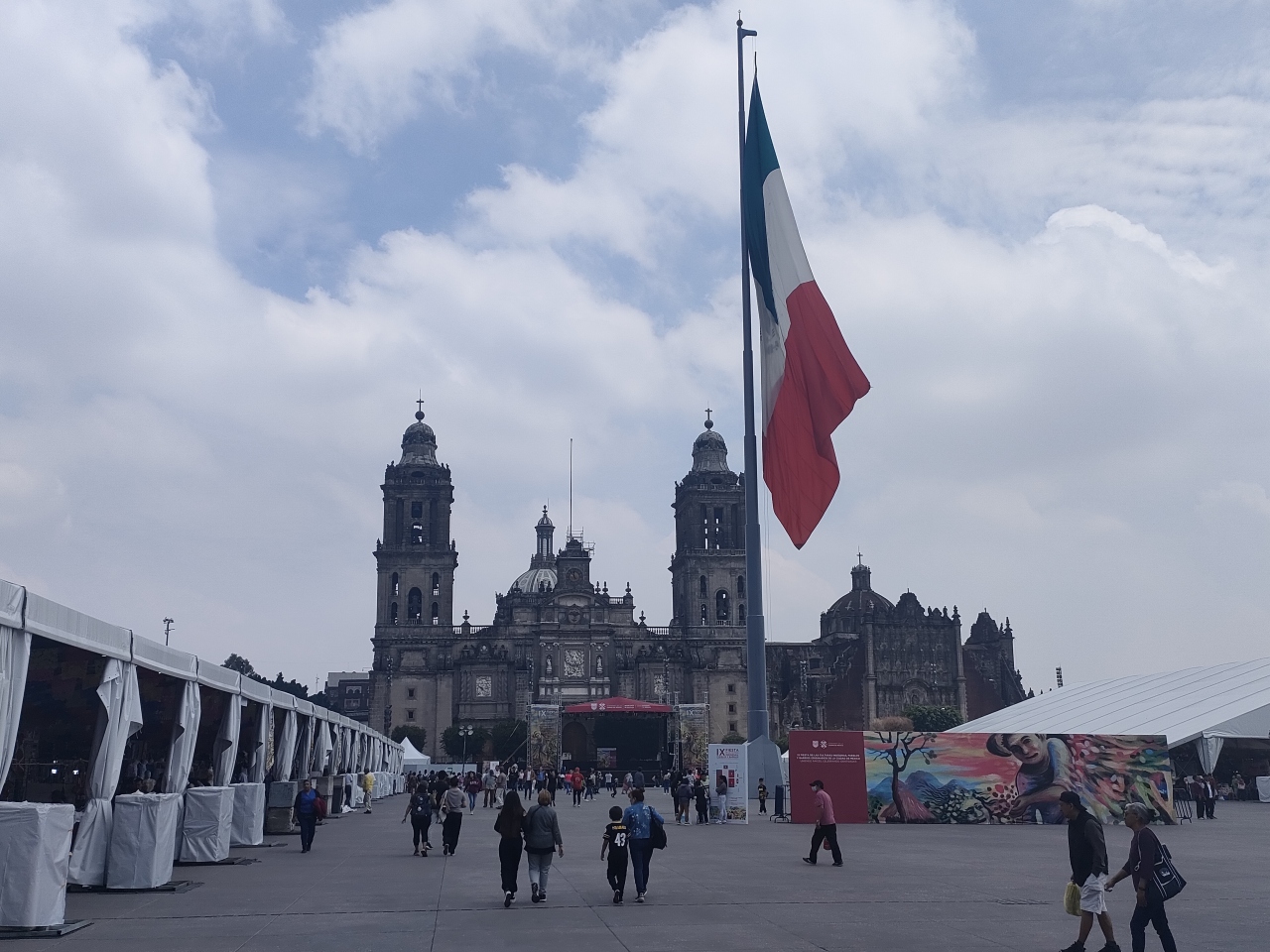メキシコシティ歴史地区の中心部にある広大な広場です。まわりは歴史的な古い建物に囲まれていて歴史を感じる広場となっています。私が訪れたときは何かのイベントが開催されており、広場の中には多くの仮設的なテントが張られて物販会場となっていました。大きな国旗が広場の目印です。