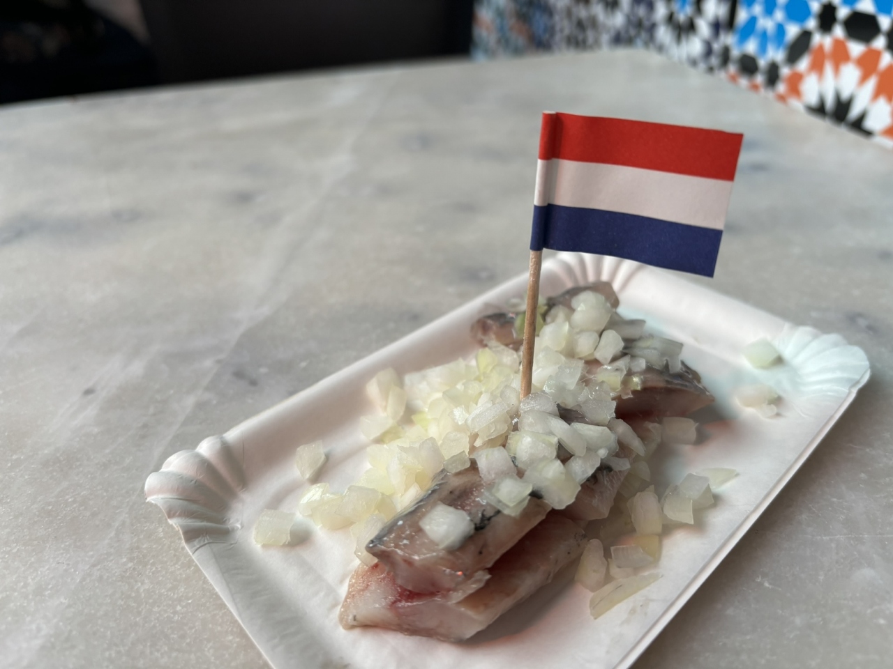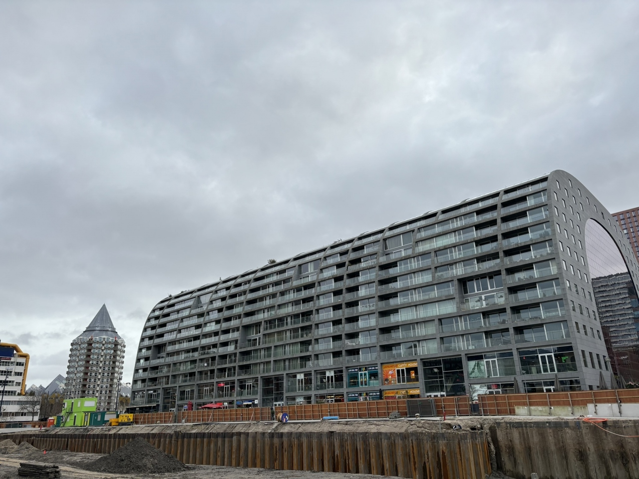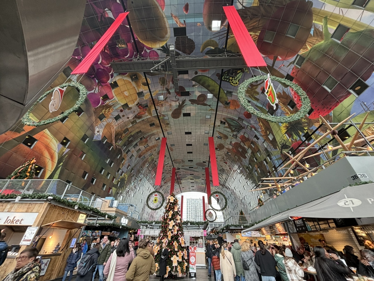 中央駅からラインバーン商店街を抜けて少し歩くと、突如ドドーン!とカマボコ状の謎建物が鎮座しています。その先にある鉛筆状のビルと対で「鉛筆削り」とも呼ばれるとか。正面から見るとまたフォルムが実にラブリー!約十年前にオープンした屋内型市場のマルクトハルです。外は鈍色の空なのに、よほど明るくて陽気な天井に覆われています。一階には飲食店も多数。お目当てのハーリングは魚屋さんの2階スペースで満喫できました。