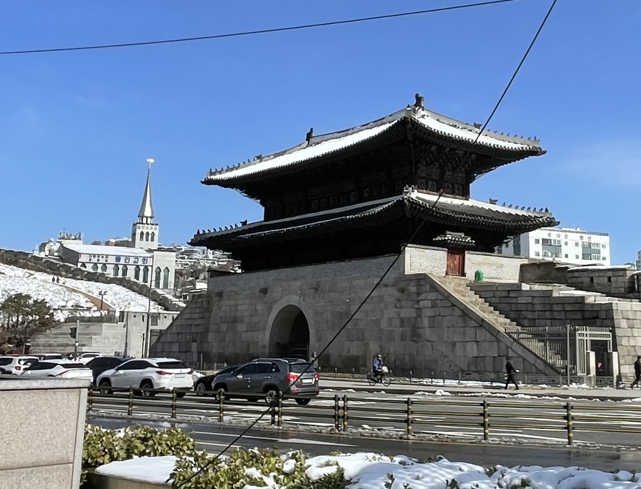 東大門市場の北側にある国宝興仁之門 (東大門)。東大門地区に宿泊することも多いので見慣れていましたが、この日は青空で冠雪していて、いつもより厳かな雰囲気と美しさが増していました。積雪が少ないと聞くソウル、貴重な機会でした。
