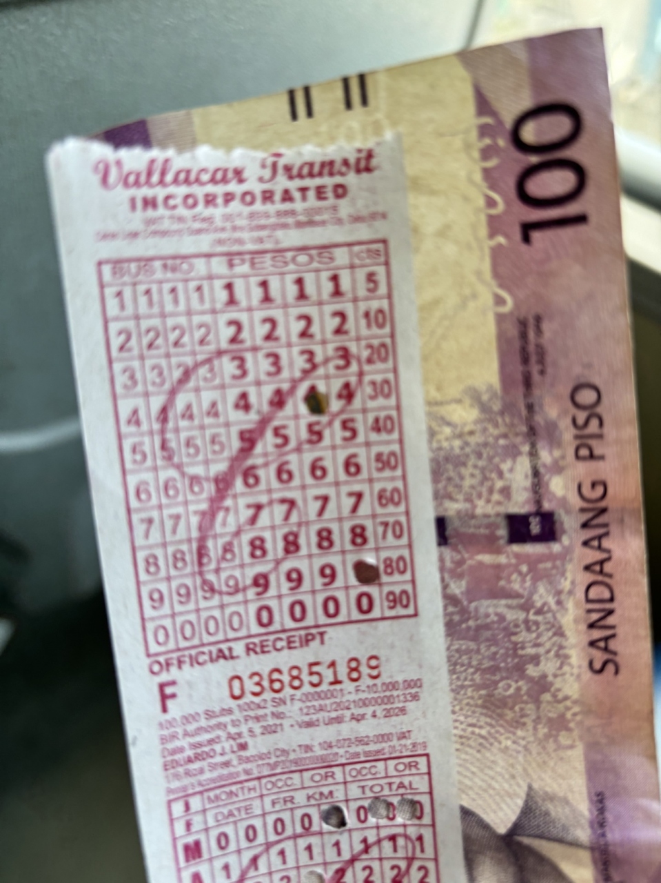 初めの4キロまで一律15ペソの路線が多いかもしれませんが、長距離路線は、乗務員さんに行き先を告げると、まず十の位と一の位の数字に穴があいたチケットを渡されて、それで値段がわかるのでお金を用意して、再度まわってきてくれた時に料金を払う感じでした。周りを見て見よう見まねでやりましたが、たまたまなのか、乗務員さんはどの路線も優しかったです。