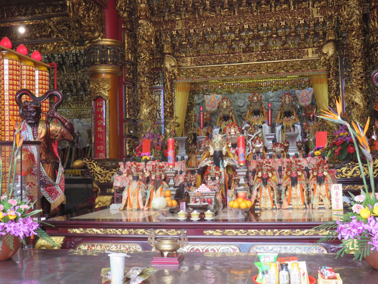 天后宮の媽祖像は「軟身神像」と呼ばれる手足が動かせる珍しい神像で、1668年に鄭成功の船隊が湄洲から持ち込み、廟を建てて祀ったと伝えられています。天后宮の屋根の上には「天官賜福」の装飾が施され民の平安幸福を見守っているようでした。