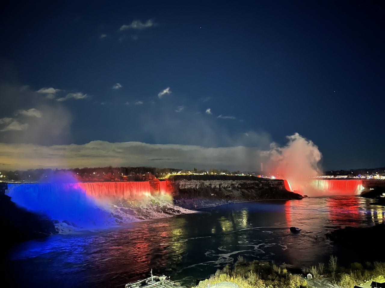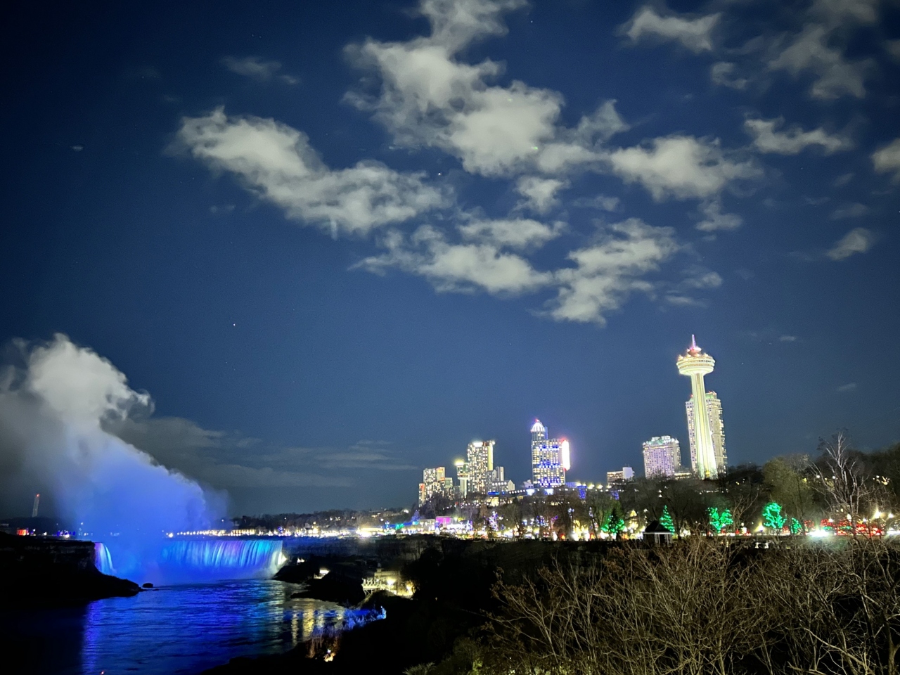 レインボー・ブリッジから歩いて5分ほどの、グランド・ビュー・オブサーヴェイション・デッキ(Grand View Observation Deck)から眺めました。寒い季節でも人気なので、デッキの前の方は埋まってしまいます。アメリカ滝からカナダ滝まで一連にライトアップされ、その色は赤、青、レインボーなど時間とともに変わります。ナイアガラを見るならやはり明るい日差しの下で自然の景観でしょう。アミューズメントチックなライトアップなんて…と思ってましたが、特にレインボーは想定外なほど鮮やかでインパクトを受けてしまいました。昼の滝はもちん良いですが、夜の滝も捨てがたいです。