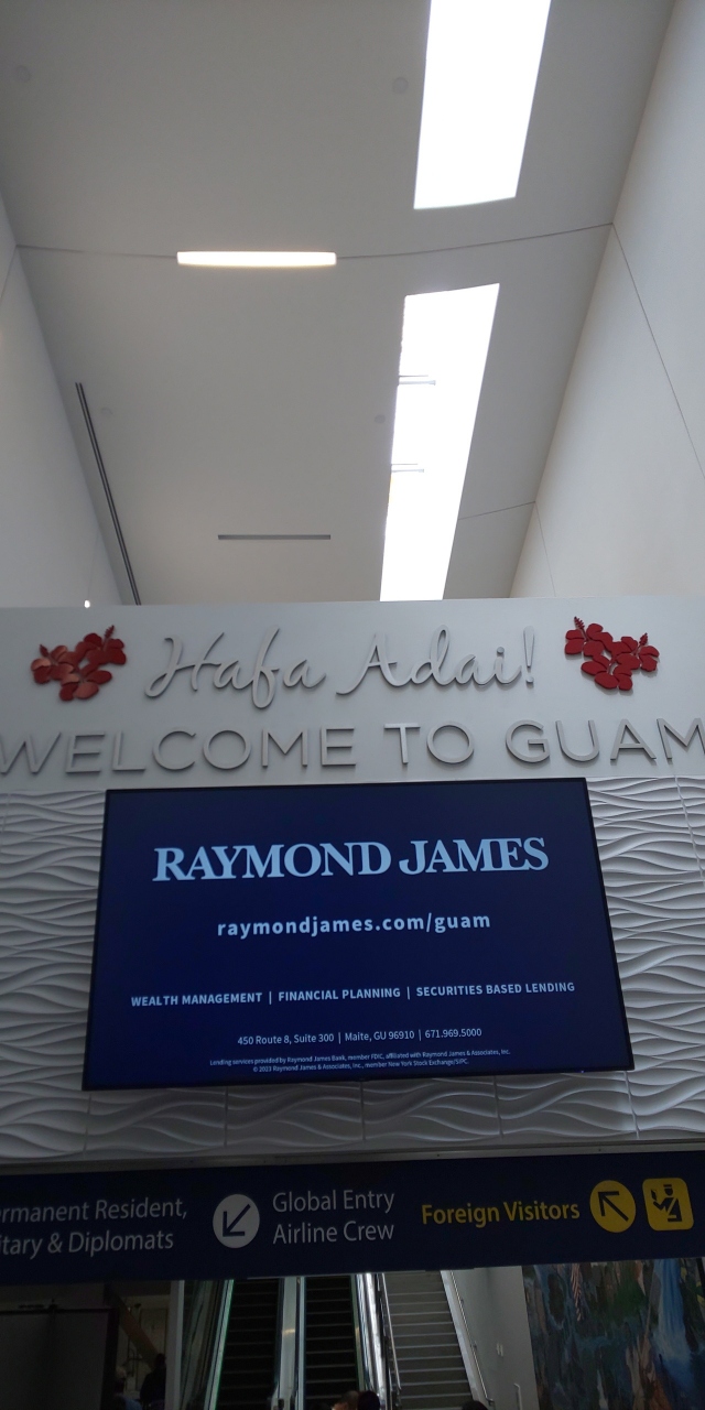 チャモロ語の挨拶、ハファダイの文字と英語のウェルカムで訪問客を迎えてくれる空港です。挨拶がハイビスカスの飾りとともにデザインされていました。南国感あふれる雰囲気がグアムに来たワクワク感をかきたてます!
