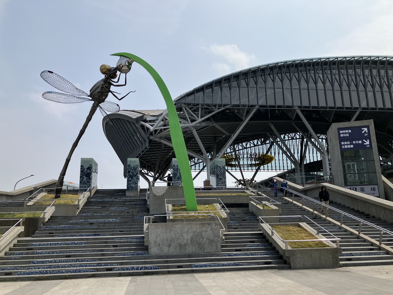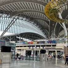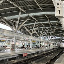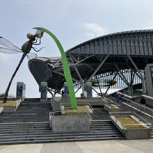 旧駅舎を残して2016年に新築のモダンな新しい高架駅になりました。シンプルな構造で構内はわかりやすいです。駅前広場から2階コンコースへ上がると改札口やチケット売り場、観光案内所などがありホームは3階にあります。広場には大きなトンボのモニュメントが印象的でした。