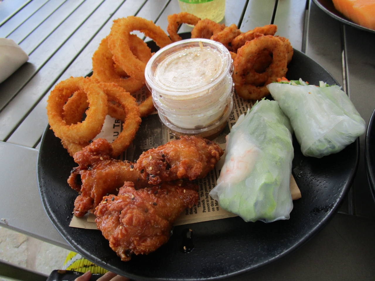 ラグーンプラッターは、カラマリ(烏賊)のフライ、海老入り生春巻き、クリスピーチキンウイング、オニオンリングの盛り合わせ