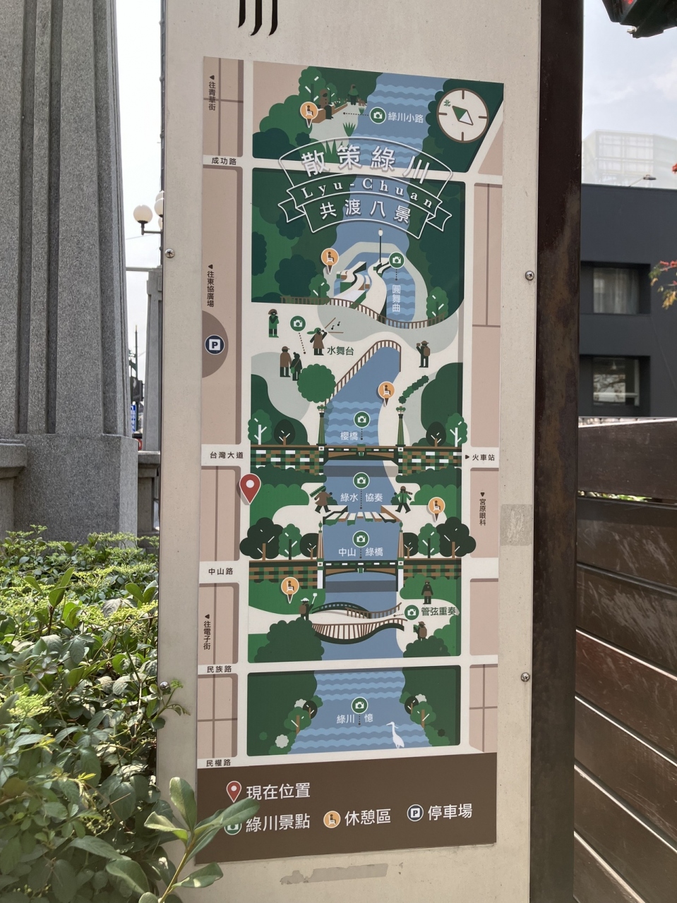 台中の人気ショッピングスポット「宮原眼科」のすぐ側を流れる「緑川」の水辺で、自然とアートをテーマに整備された遊歩道です。中山緑橋や桜橋遺跡もあり観光客はしばし足を休めていました。夜はライトアップされ昼間とは違った雰囲気で人気スポットとなっています。