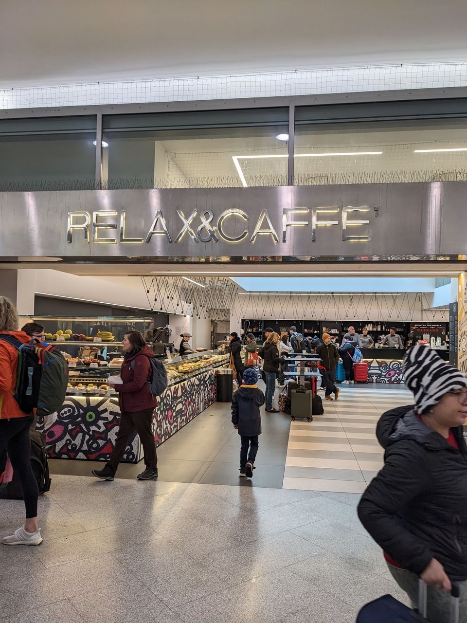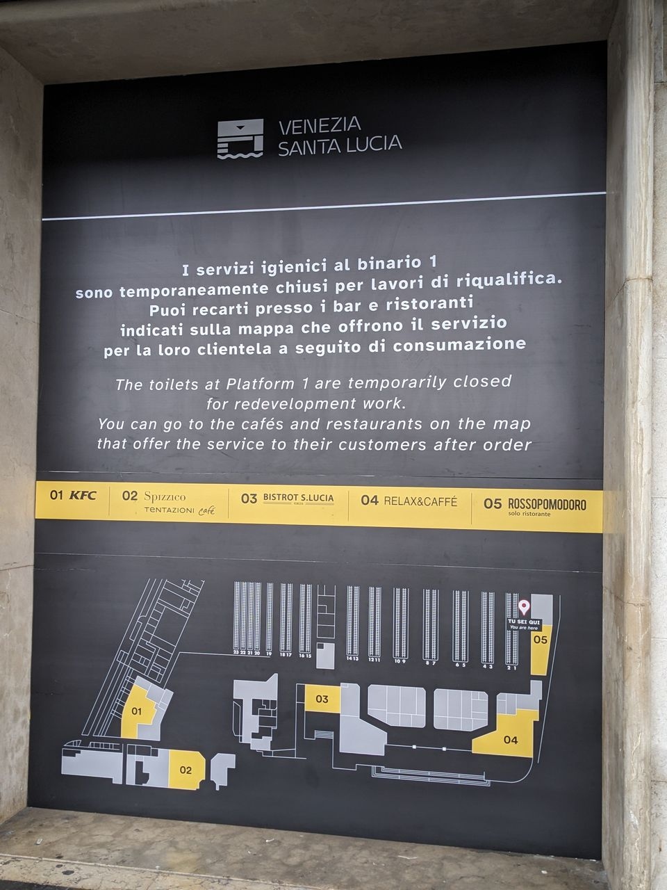 その前にまずはトイレに、と言う事で、電光掲示板に向かって右手、1番線ホームに向かいましたが..なんと、工事中! 「カフェを使ってね」の掲示が。私たちは、4番のRELAX&CAFFEに行きました。