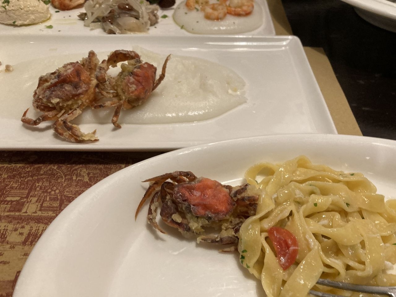 前菜の盛り合わせ、モエケ(春先だけ出る、ソフトシェルクラブ)、カニのパスタ、ティラミス、オンブラ250ml、アクアガッサータにコペルトで、100eur。とても美味しくいただきました。