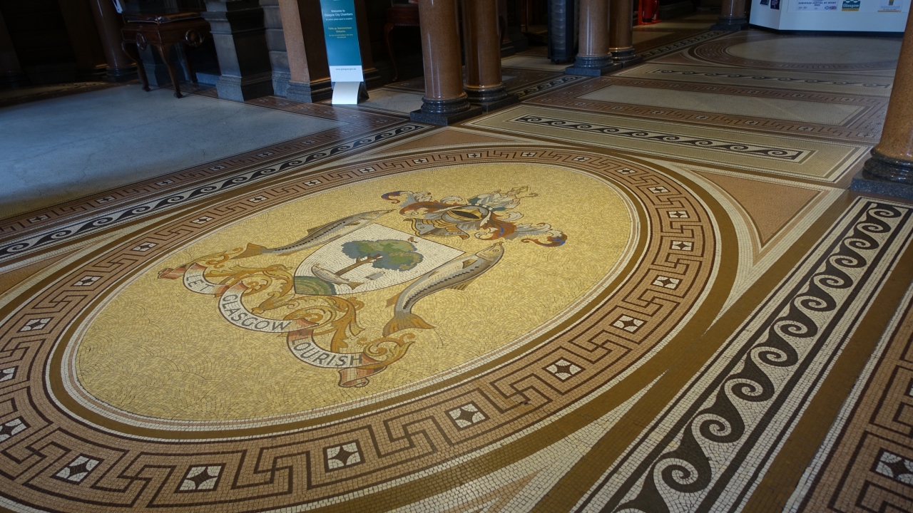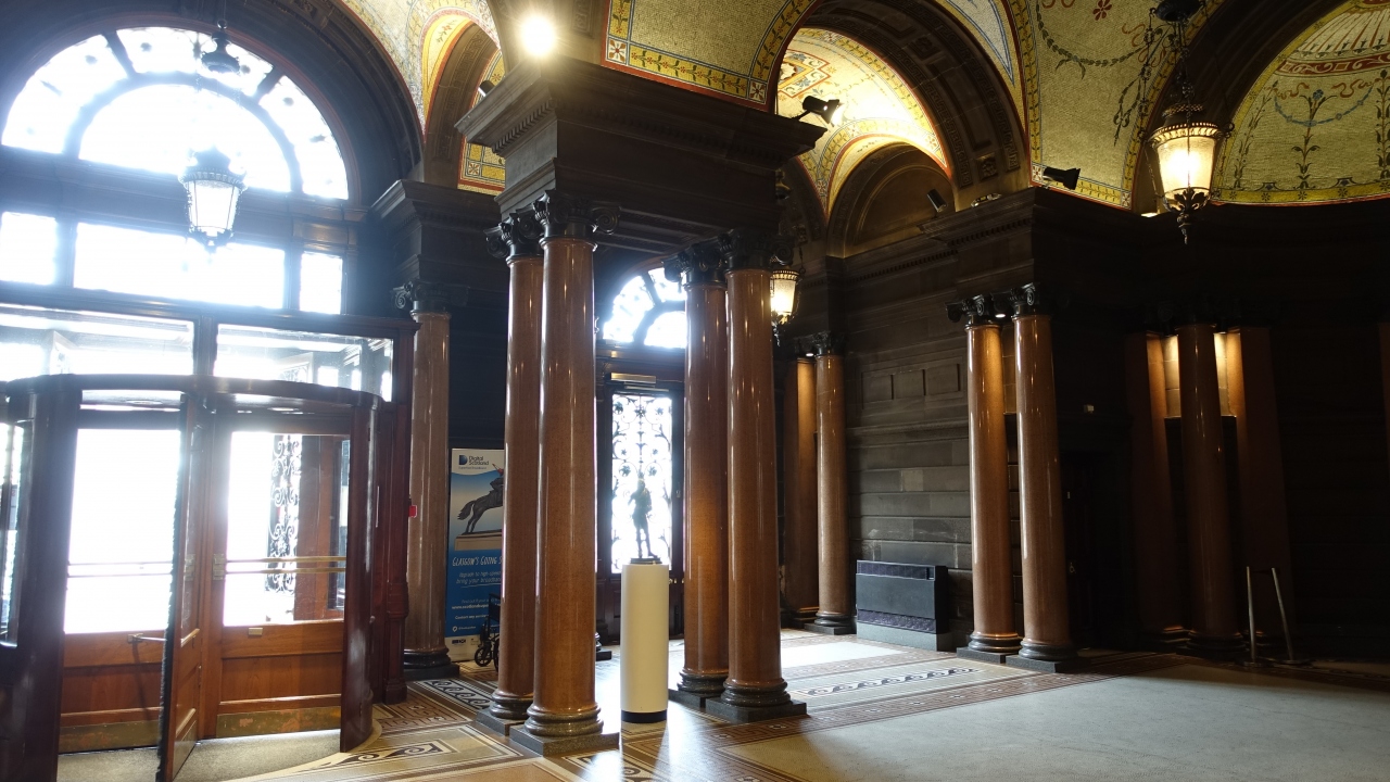 シティセンターのジョージスクエアの正面に建つグラスゴー市庁舎は1888年建築にルネッサンス様式で建築された。産業革命による工業と貿易の町として栄えた時代を彷彿とする堂々とした建物で、正面ファザードは豪華な柱や彫刻で飾られている。