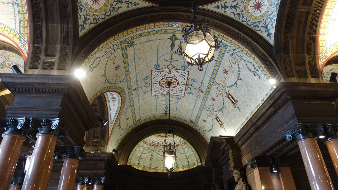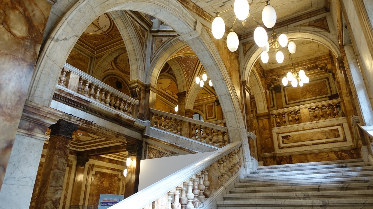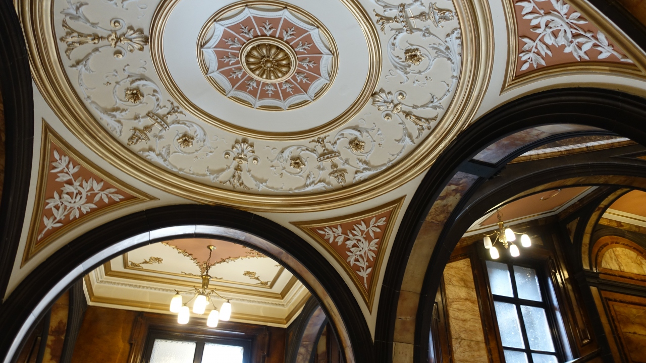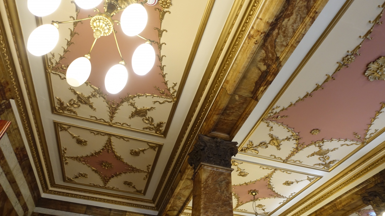 重厚な扉からエントランスホールに入るとブラウン中心の色彩で多くの円柱が立ち、モザイク模様の天井と床が美しい。1階はデザインの異なる2つの空間に分かれ、一方は煌びやかな白の大理石と金箔の階段があり、ロココ調の天井に豪華なシャンデリアが下がる。もう一方は木をふんだんに使い、色も木目調と落ち着いた雰囲気。平日であれば建物内の限られた範囲を無料で見ることが出来、写真もOK。