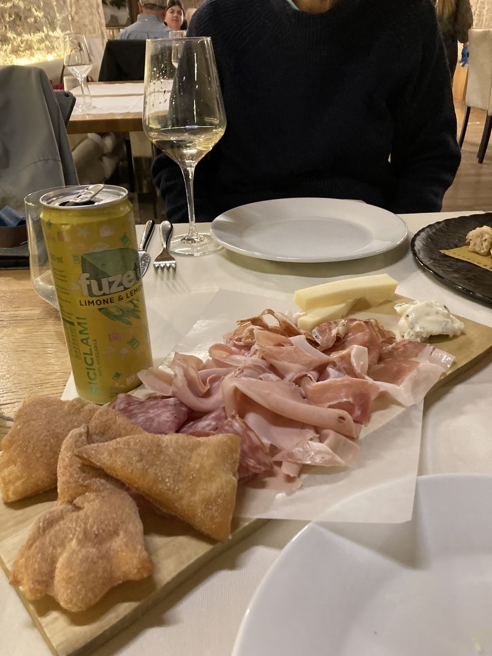 前菜盛り合わせ、カラマリ、ピザ1枚、ワイン2杯、レモンティー、お水で、63eur。お手頃価格で美味しいご飯を頂けました。