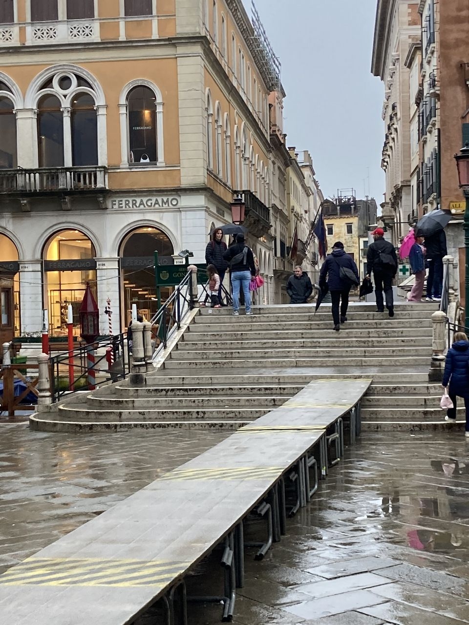 サンマルコ広場の観光を計画した日は、朝から雨模様。ホテルからサンマルコ広場へ向かう途中のサンモイゼ教会前の広場には、これが噂のアックア・アルタ用の通路!? 幸い高潮はありませんでしたが、サンマルコ広場には雨であちこちに大きな水たまりが.. 通路はこのためだったんですねえ。