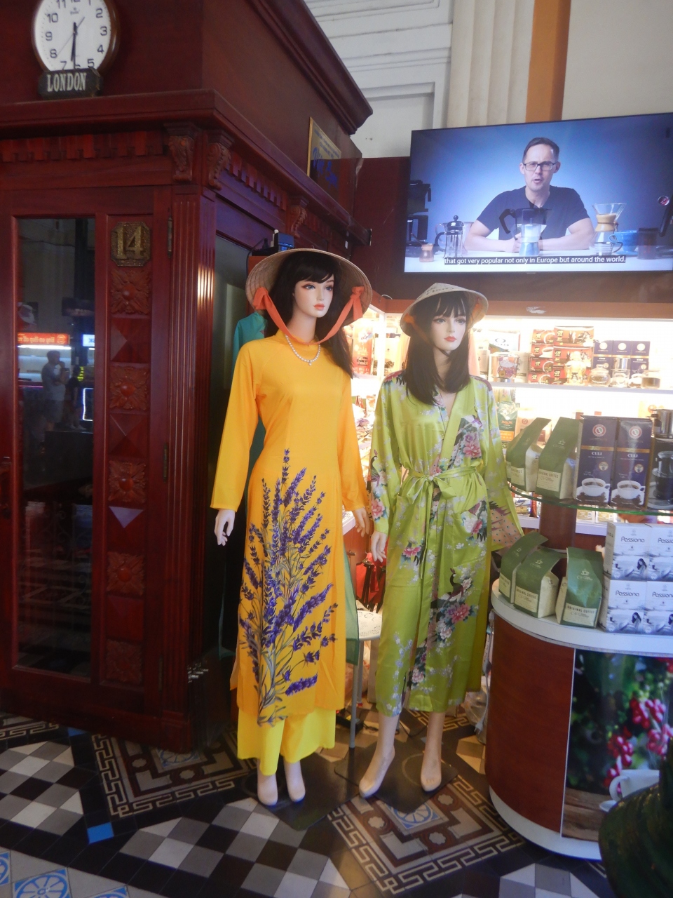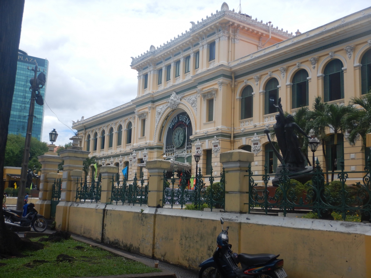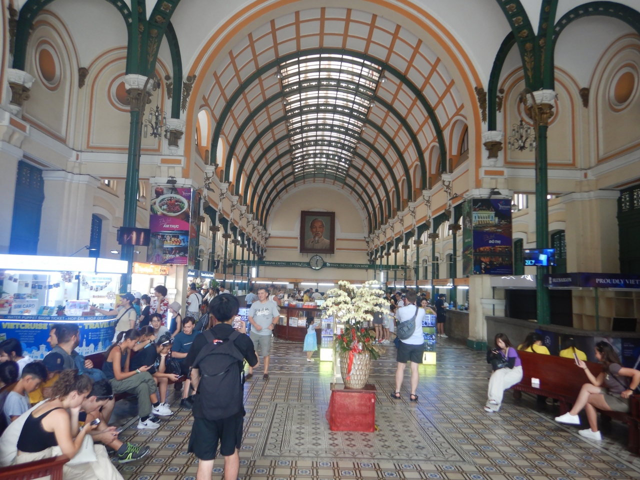 19世紀末フランスの統治時代に建てられたもの。観光地になっているが今でも現役の郵便両サイドで郵便業務を行っており、中央は土産物売り場のなっている。建物の入口に近い両脇にも土産物屋が並んでいる。アオザイを着たマネキンがベトナムらしくてよかった。