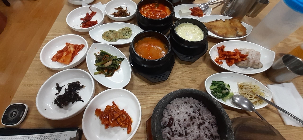 ポッサム、スンドゥブチゲ、ビジチゲ(おからチゲ)、ナムル、チヂミ、キムチ、焼き魚、トルソッパブ(雑穀米みたいな釜焚きごはん)ケランチムなどテーブルいっぱいのお料理が11000Wです
