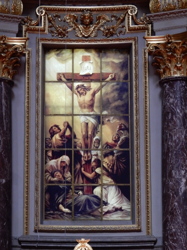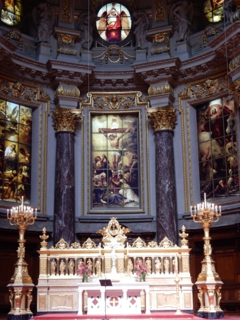 ターコイスブルーの高いドームを備えた歴史ある教会です。内部に入ると、建物の外観にも劣らないステンドグラスや彫像の装飾があり、荘厳な雰囲気につつまれています。