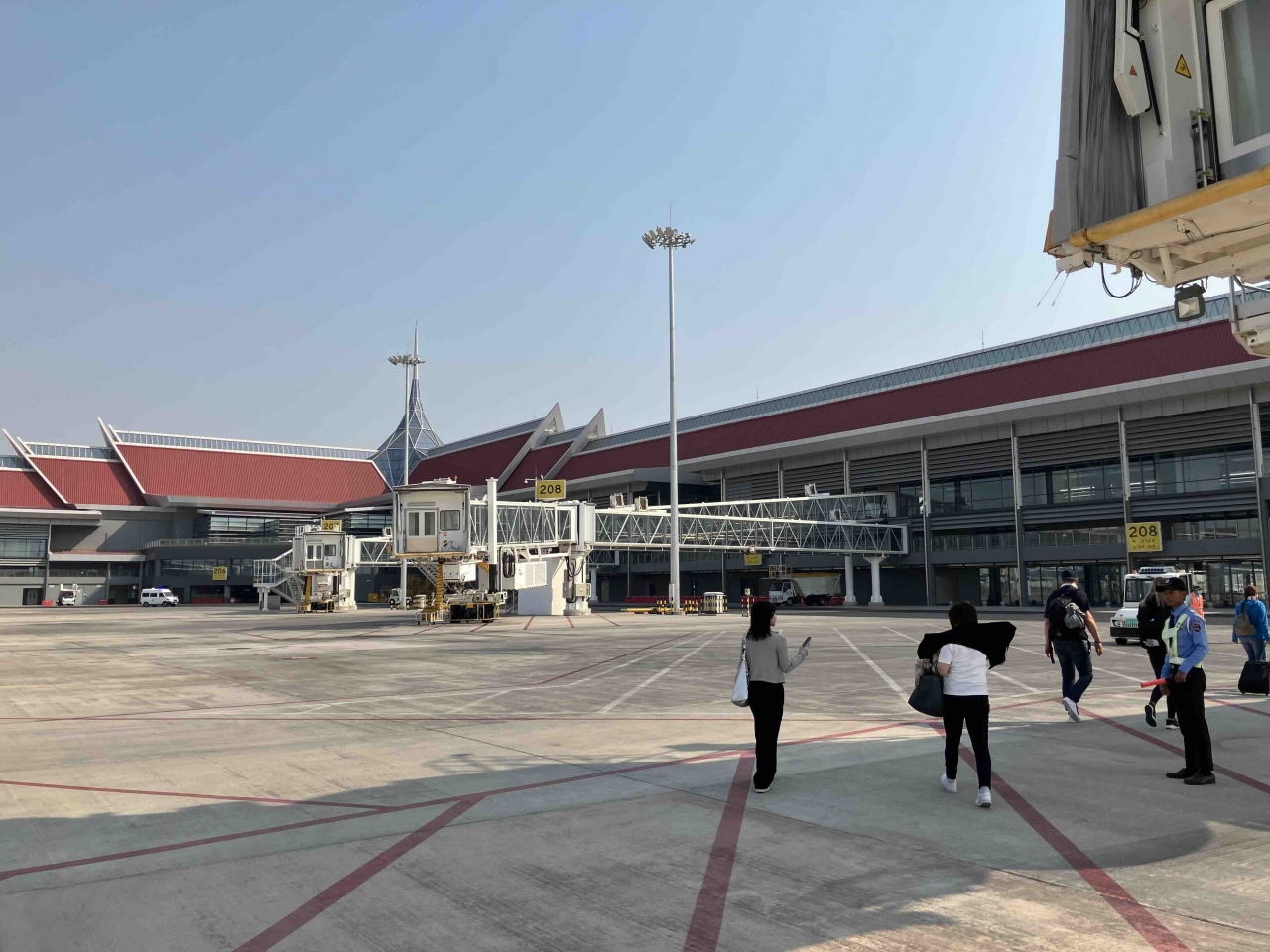バンコクのスワンナプーム国際空港からバンコクエアウェイのプロペラ機に乗って約1時間で到着しました。まだできたばかりの新しい空港で、古い空港はシェムリアップ市街から近かったようですが、この新しい空港は車で1時間とかなり離れた不便な空港です。中国が作った空港のようで、あちらこちらに中国語が溢れていました。